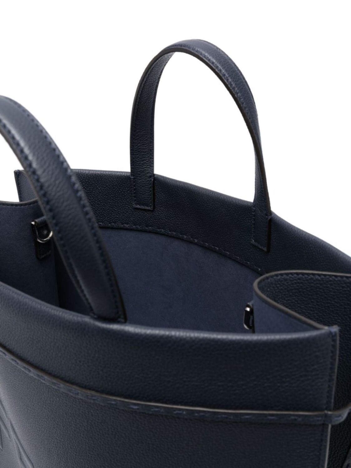Темно-синий, телячья кожа, тисненый логотип спереди, две плоские верхние ручки, съемный регулируемый ремень на плечо, дизайн с открытым верхом, застежка с боковой кулиской и основное отделение.