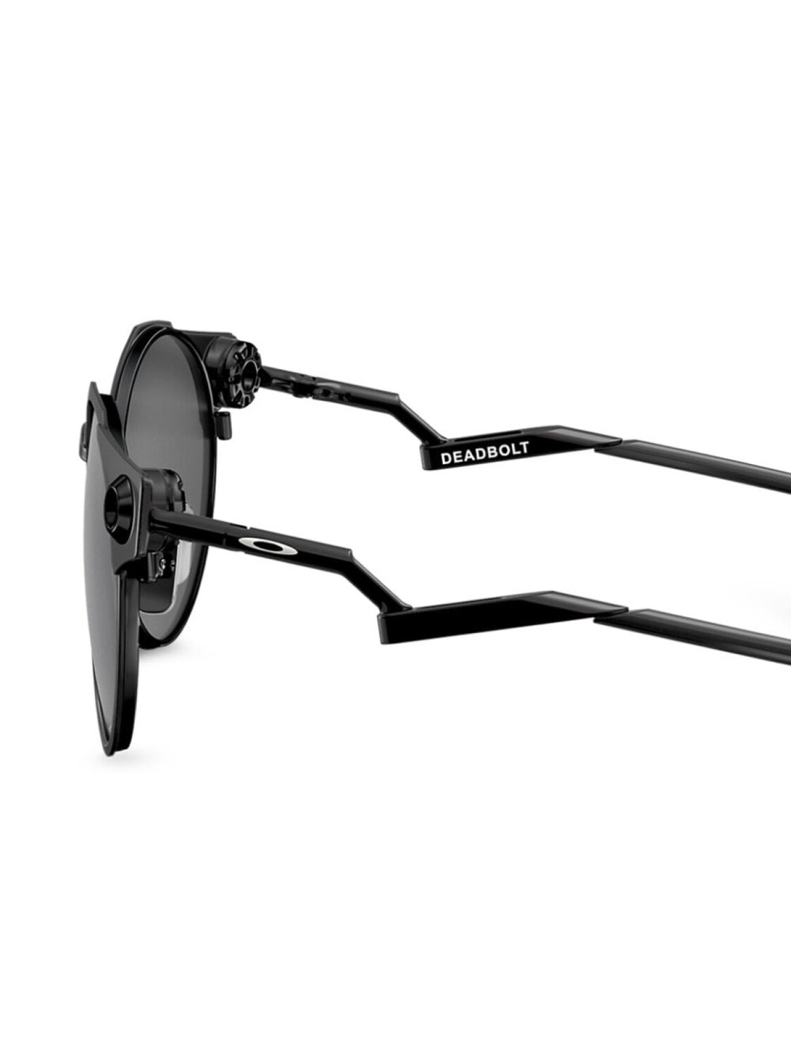 Солнцезащитные очки Deadbolt в круглой оправе от Oakley. Серебристый логотип сбоку, круглые оправы и затемненные линзы. Прилагается защитный чехол.