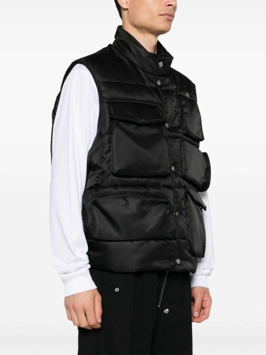 Подробнее о товаре: • черный • ткань с твиловым переплетением • стеганная модель • дутый материал • знаковый логотип-стежок • знаковый узор с цифрами • высокий воротник • застежка на кнопках спереди • без рукавов • два передних кармана с клапанами • карман на молнии спереди • два передних кармана на кнопке • два вшитых кармана по бокам • закругленный подол • цельная подкладка