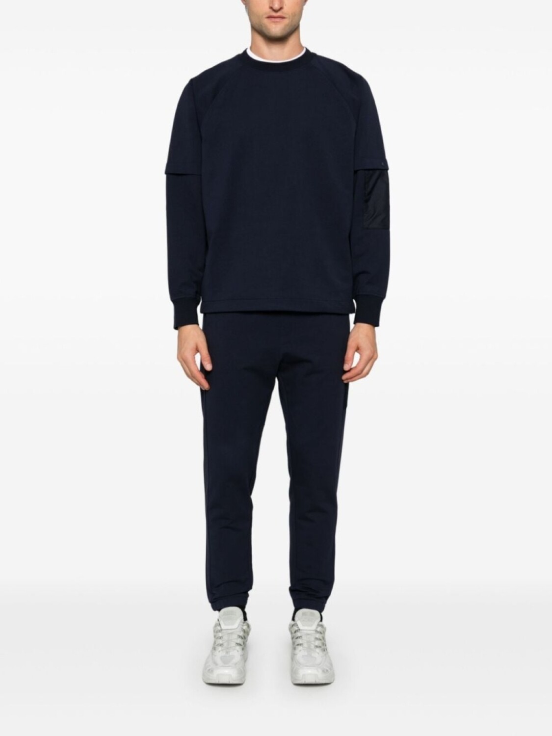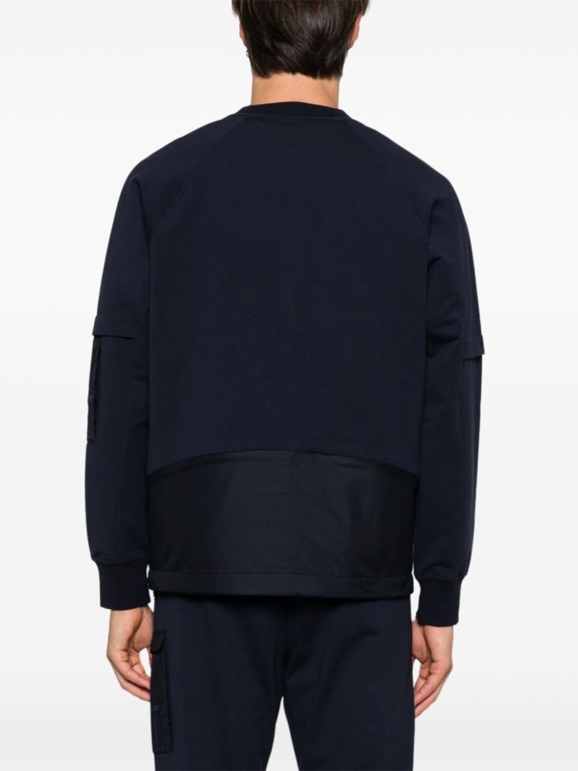 Темно-синий, эластичный хлопок, ткань джерси, дизайн со вставками, круглый вырез, длинные рукава реглан, карман на рукаве с застежкой на кнопке, манжеты в рубчик, два кармана на молнии сзади, прямой подол с кулиской