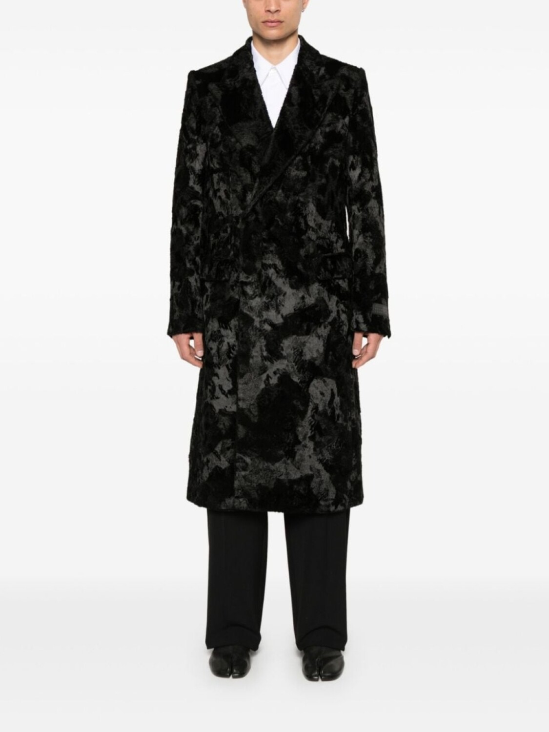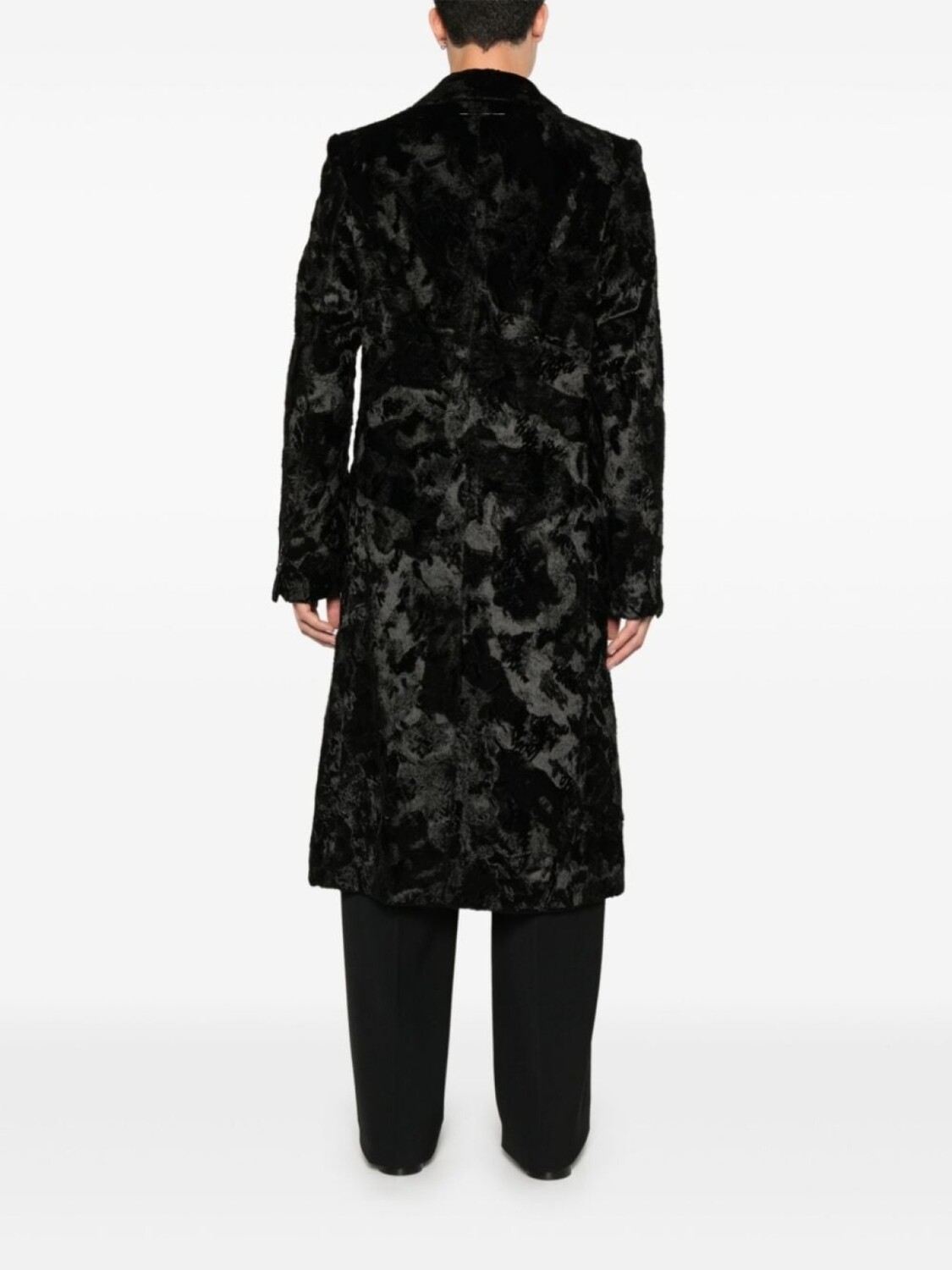 Подробнее о товаре: • черный • жаккардовый материал с узором • искусственный мех • знаковый логотип с цифрами на манжетах • широкие заостренные лацканы • подплечники • длинные рукава с манжетами на пуговицах • два передних кармана с клапанами • шлица по центру сзади • двубортная застежка на пуговицы • внутренний прорезной карман • длинная модель • прямой подол • цельная подкладка