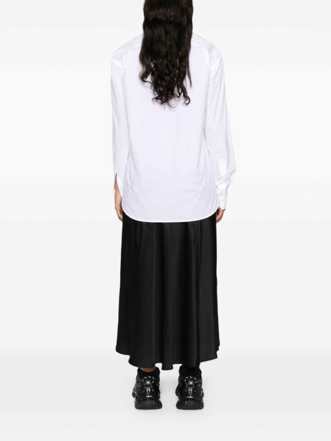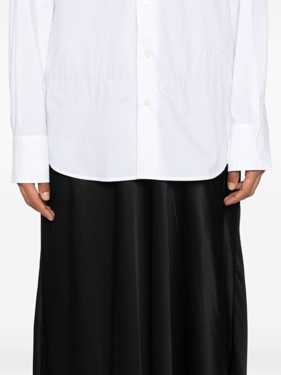 Белый/черный, хлопок, фактурная отделка, V-образный вырез, длинные рукава, манжеты на пуговицах, знаковый узор с цифрами, складки, длинная модель, прямой подол, планка на пуговицах спереди