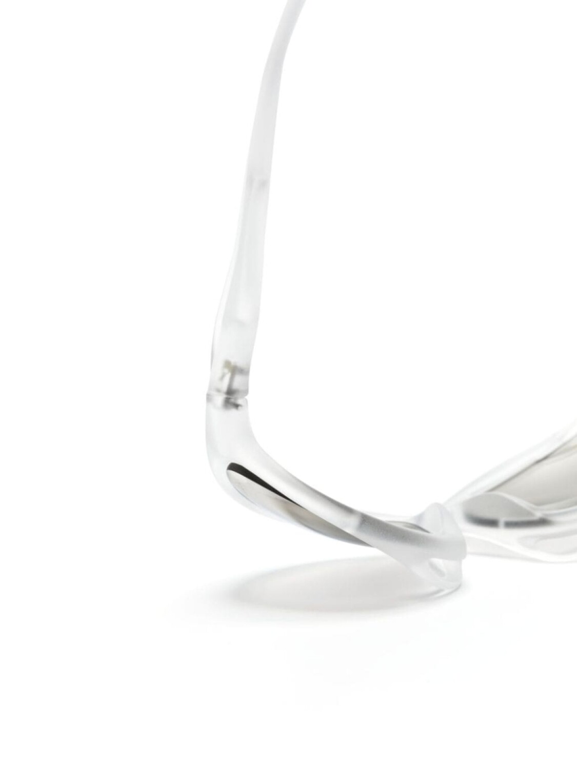 Белый, ацетат, оправа в спортивном стиле, прозрачный материал, серые линзы, линзы с защитой от ультрафиолета, вырезные детали, скульптурные дужки, логотип на дужке, дужки с закругленными концами, В комплект входит защитный чехол для очков.