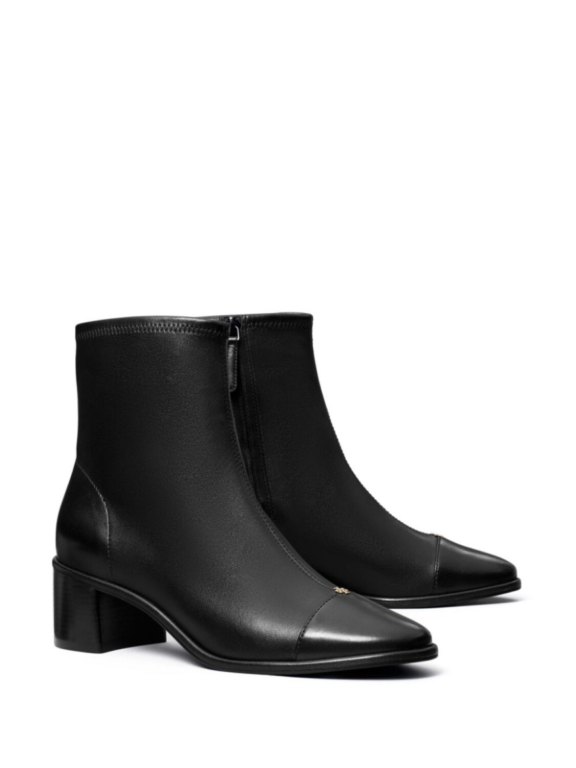 Черный, кожа наппа, застежка на молнии сбоку, золотистый металлический логотип, закругленный носок, блочный каблук средней высоты, кожаная подошва
