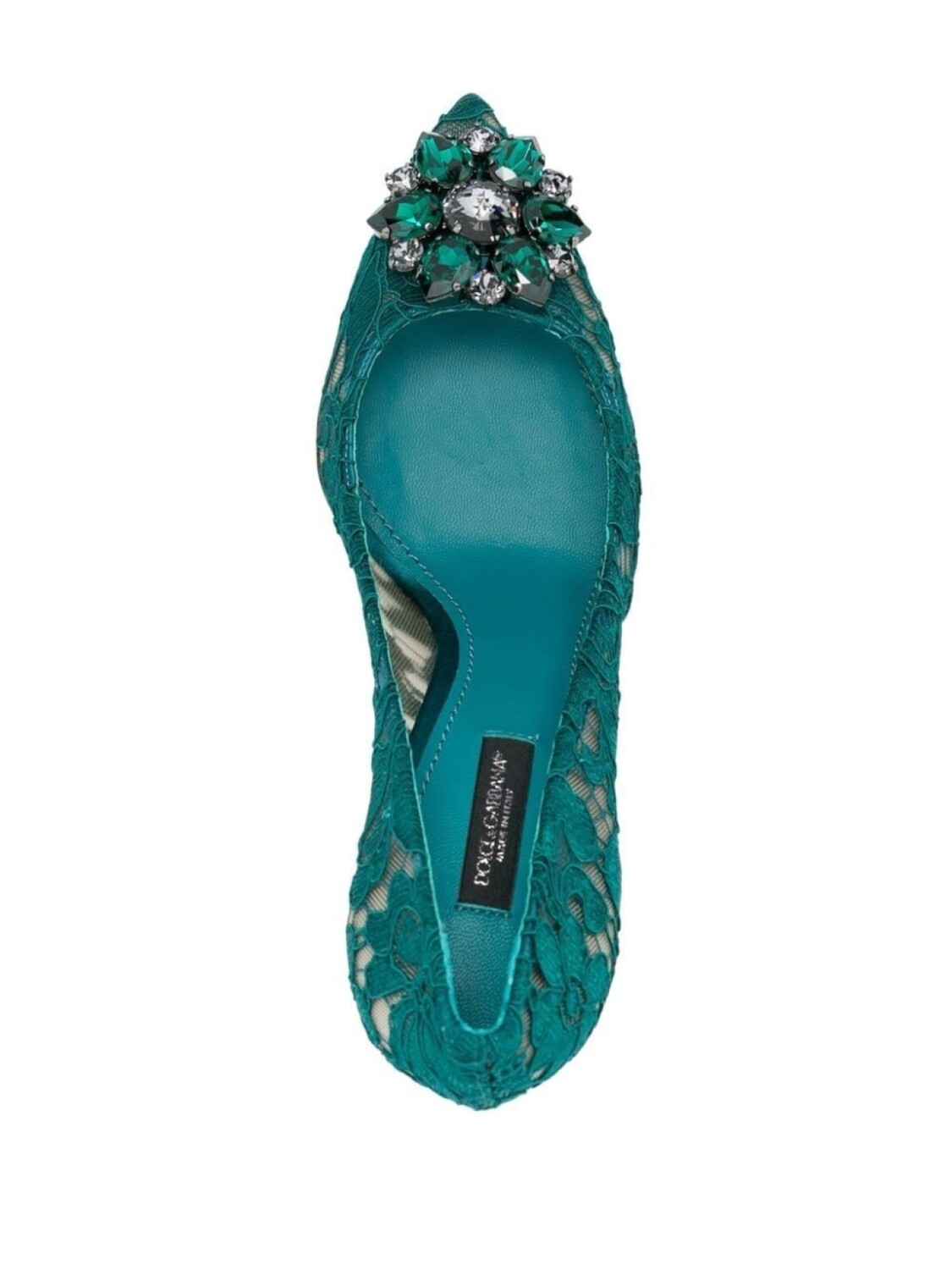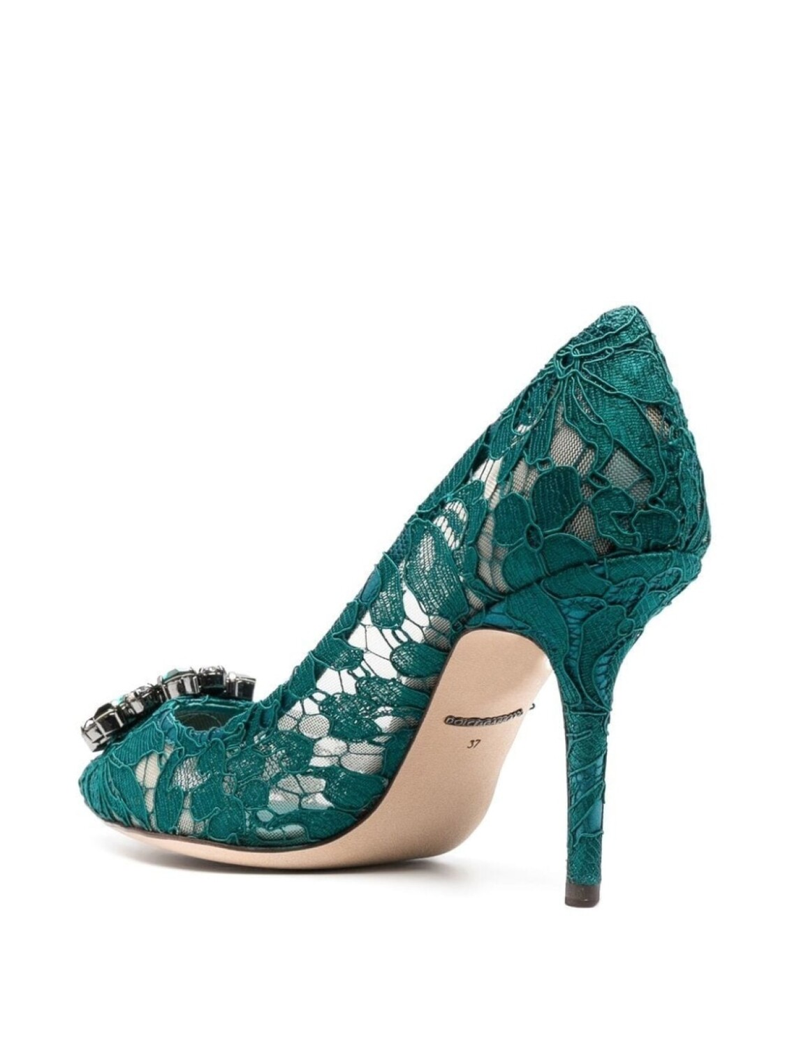 Зеленые декорированные кружевные туфли из кожи и хлопка от Dolce & Gabbana. Заострённый носок, украшения из горного хрусталя, фирменная стелька, кожаная стелька, высокая шпилька.
