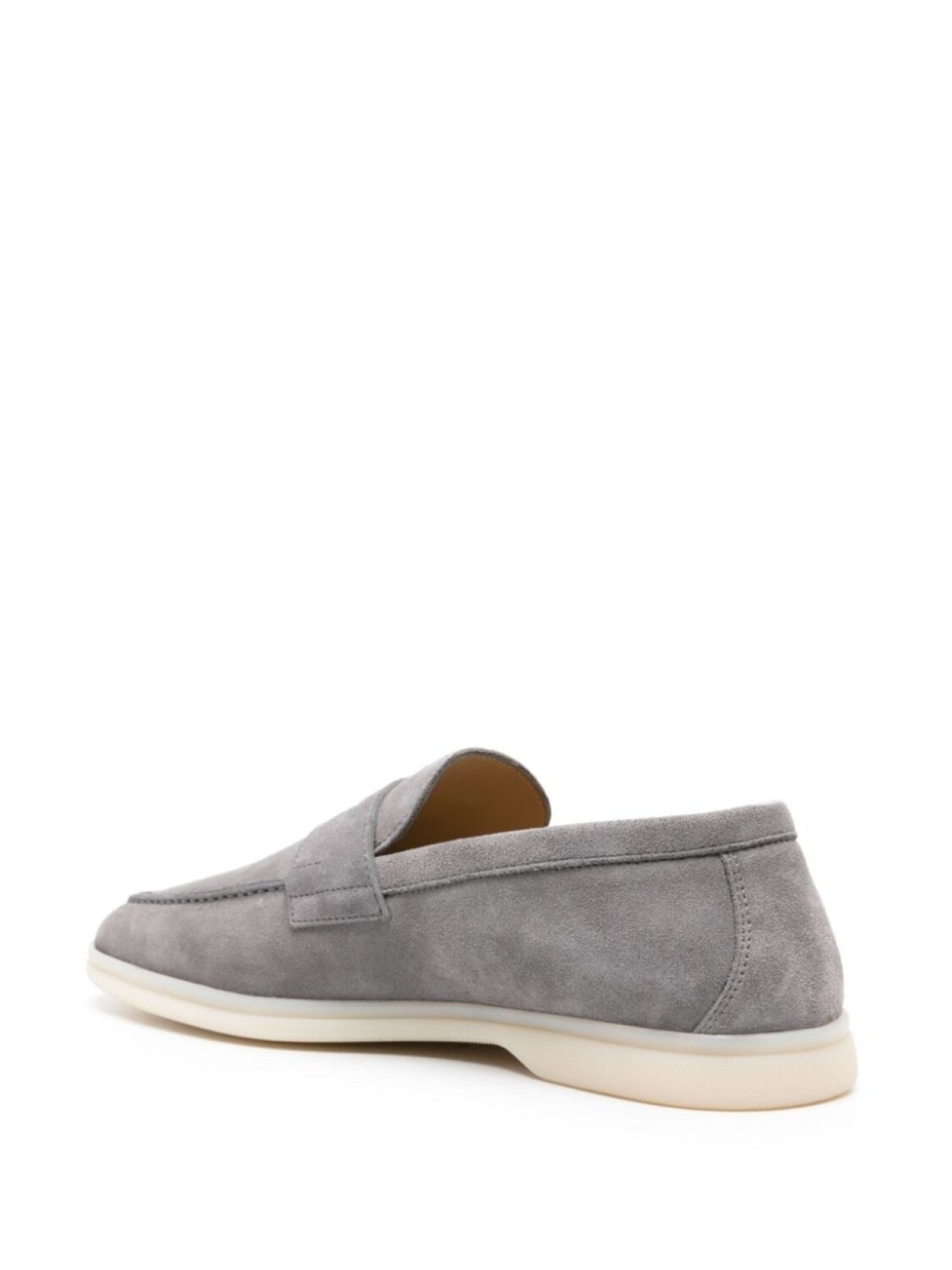 Пепельно-серый, замша из телячьей кожи, кожаная стелька с логотипом, без застежки, плоская резиновая подошва, кожаная подкладка, миндалевидный носок, прорези на язычке