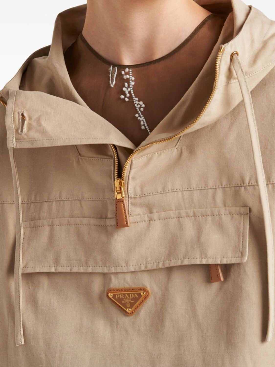 Светло-коричневый, смесь хлопка и льна, фактурная поверхность, металлический логотип спереди, затягивающийся на шнурок капюшон, приспущенные плечи, длинные рукава, рукава с манжетами на пуговицах, накладной карман спереди, подол с кулиской, короткая застежка на молнии спереди