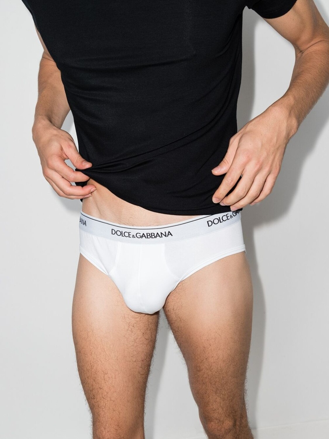 Классика всегда в моде. В коллекцию Dolce & Gabbana (Дольче энд Габбана) весна-лето 2020 вошел комплект из двух трусов-брифов белого цвета. Они выполнены из эластичной хлопковой ткани джерси и имеют эластичный пояс с логотипом. Примерка белья разрешена исключительно поверх собственного.