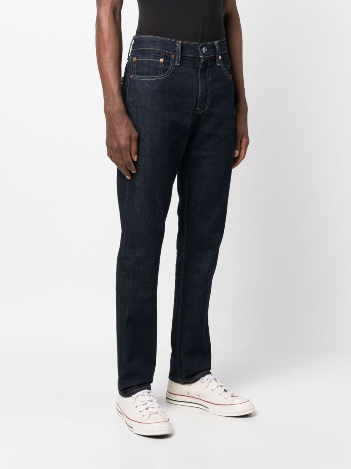Индиго, смесовый хлопок, деним, бирка с логотипом, нашивка с логотипом сзади, петли для ремня, застежка на молнии и пуговице спереди и пять карманов.