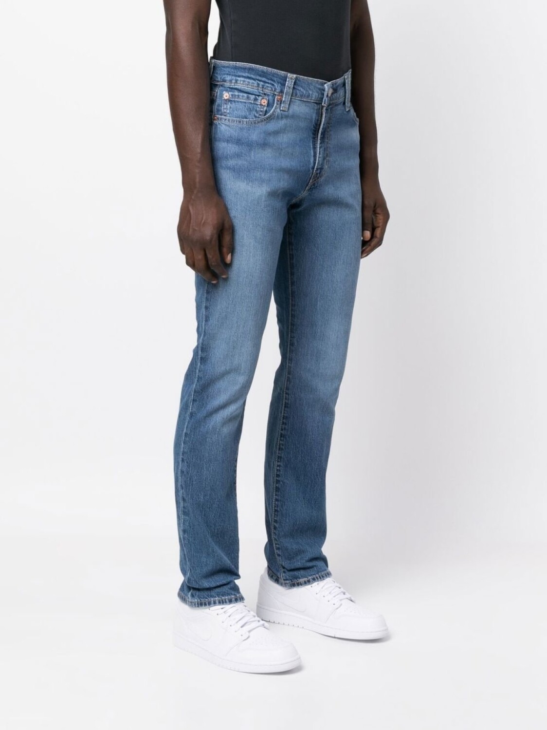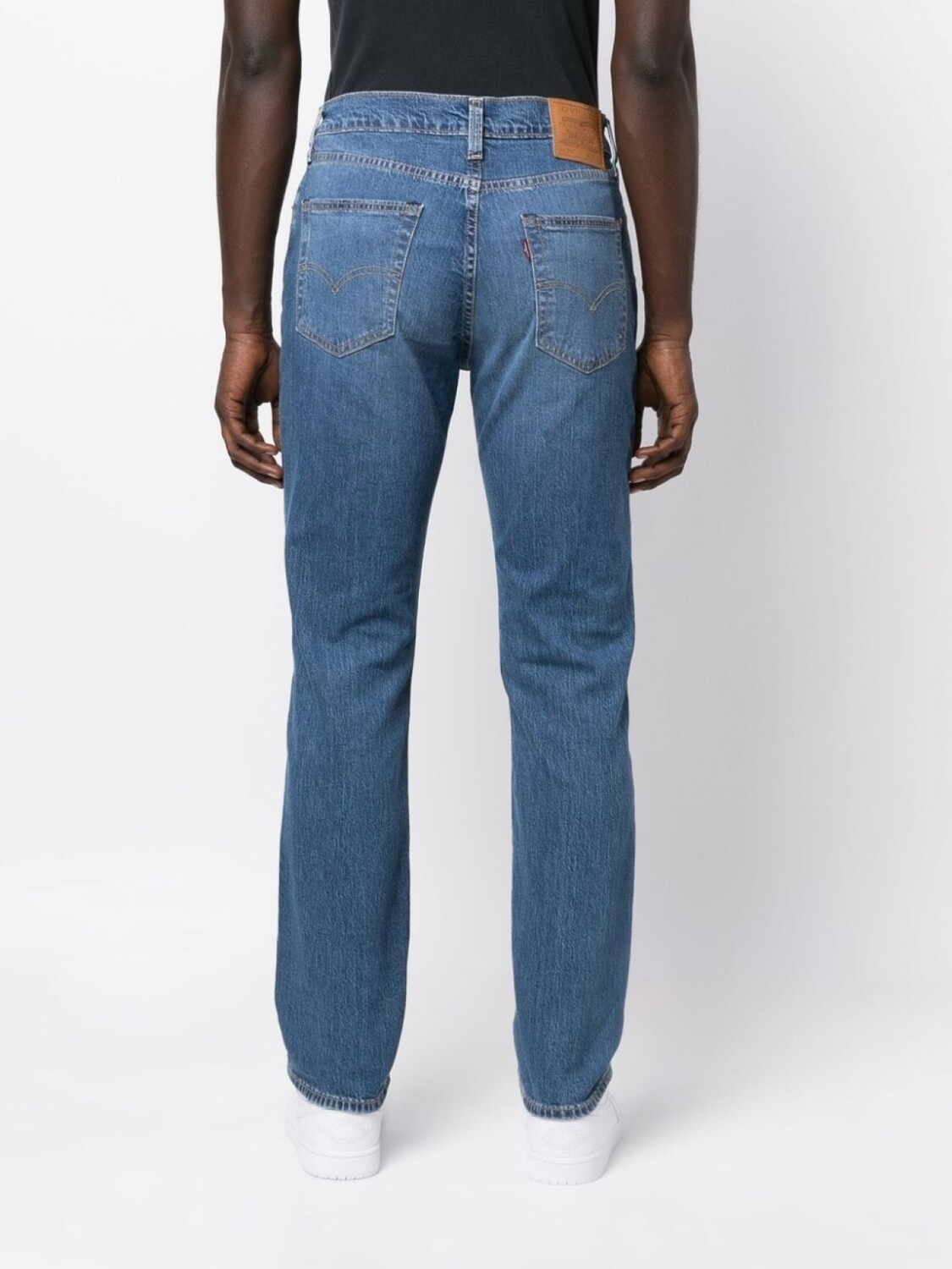 Синий, эластичный хлопок, обработанный деним, средняя посадка, застежка на молнии и пуговице спереди, пять карманов и прямой крой.