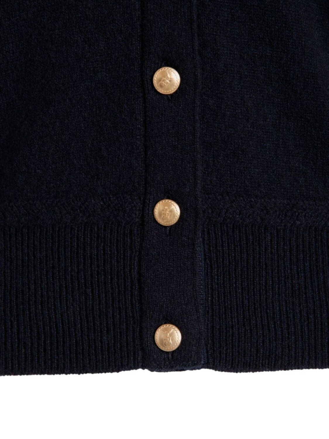 Темно-синяя кашемировая трикотажная конструкция застежка на пуговицы спереди V-образный вырез длинные рукава аппликация с логотипом ребристые манжеты и подол