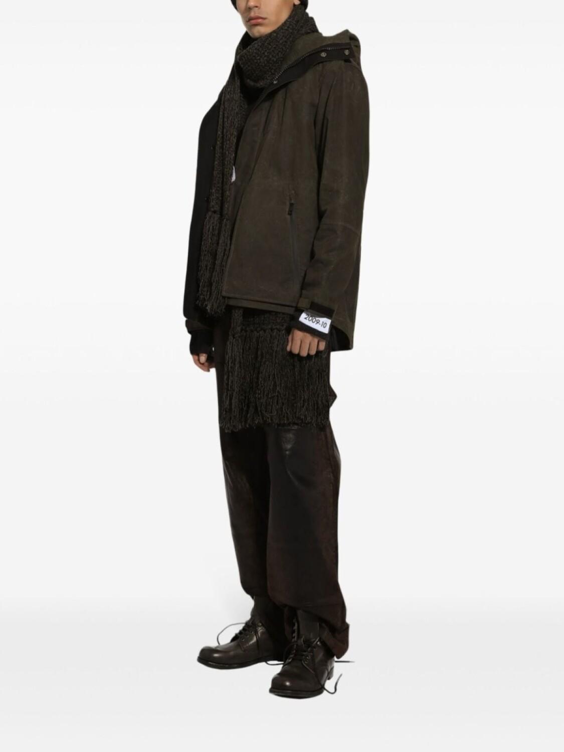 Темно-серый, смесовый хлопок, затягивающийся на шнурок капюшон, потайная застежка на молнии и кнопках спереди, длинные рукава, манжеты на липучках, нагрудный карман на молнии, нагрудный карман с клапаном, два кармана на молнии по бокам, закругленный подол сзади