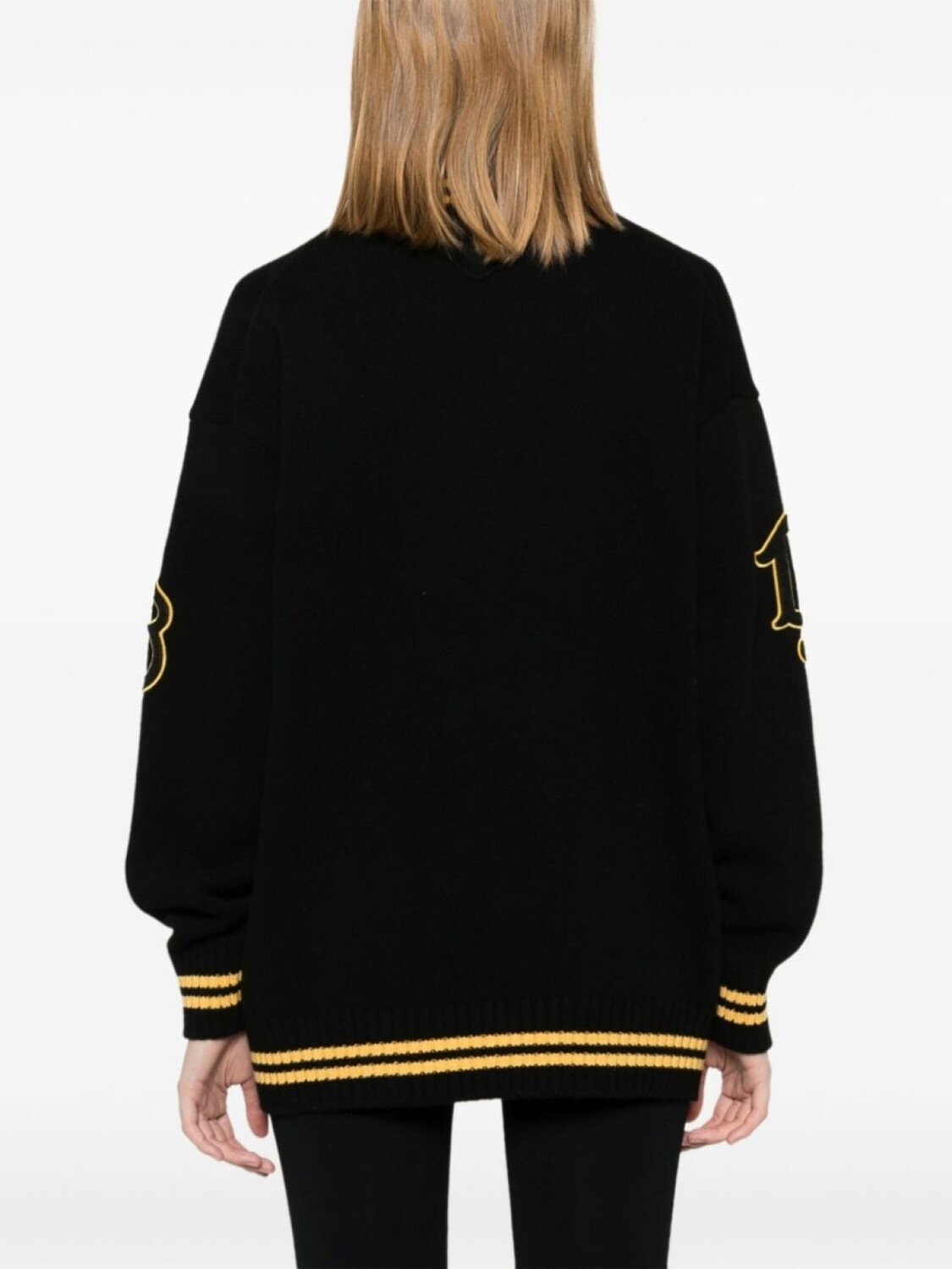 Длинные рукава, гладкая вязка, свободный крой, отделка горловины резинкой, спущенная линия плеча, манжеты и низ резинкой, треугольный логотип, застежка на пуговицы спереди, прорезные карманы, нашивки, кашемир
