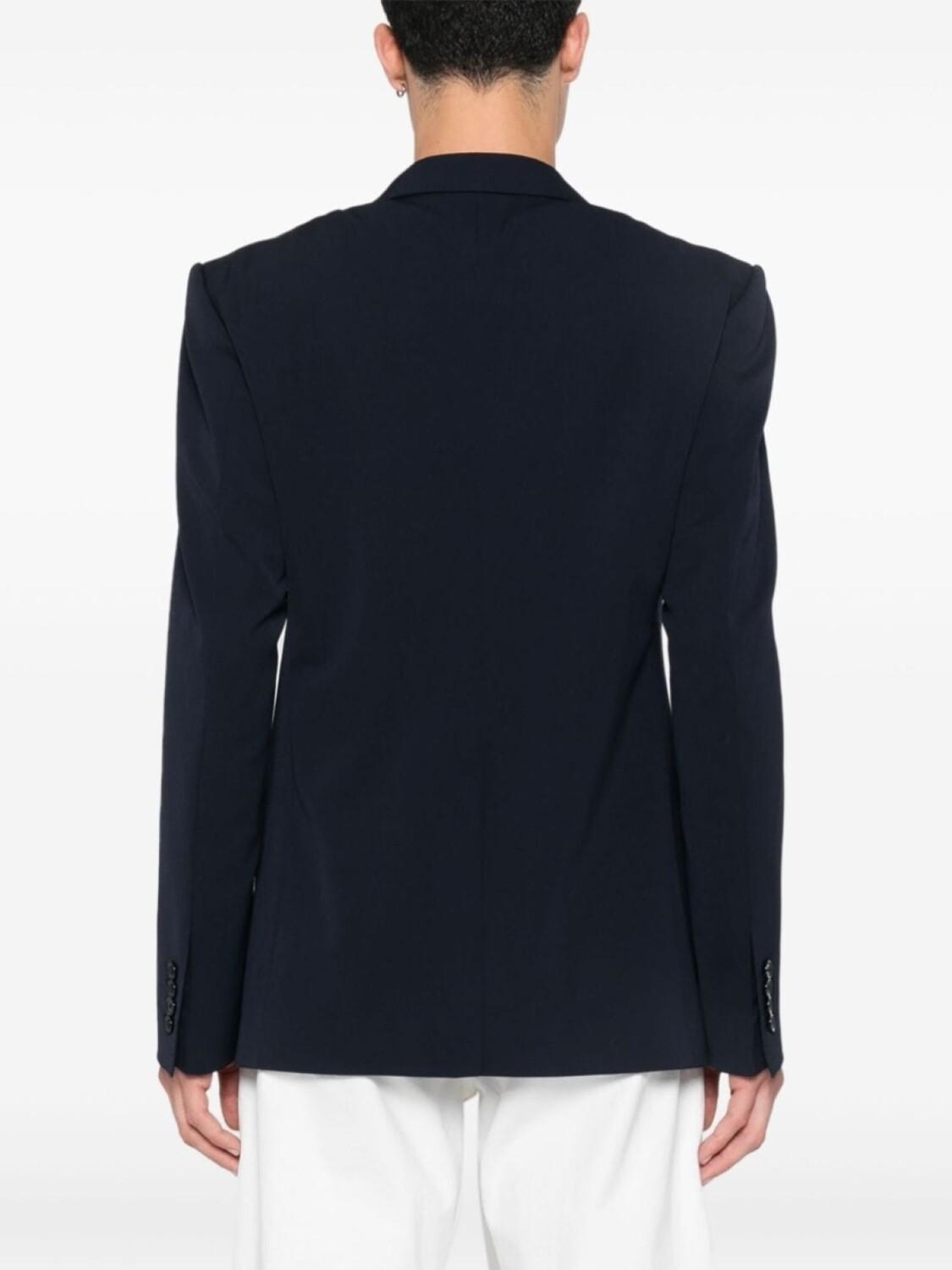 Темно-синий, смесовая шерсть, ткань с твиловым переплетением, застежка на пуговицах спереди, зазубренные лацканы, длинные рукава, рукава с манжетами на пуговицах, прорезной карман на груди, два кармана с клапанами по бокам, шлица по центру сзади, внутренние прорезные карманы, цельная подкладка, прямой подол