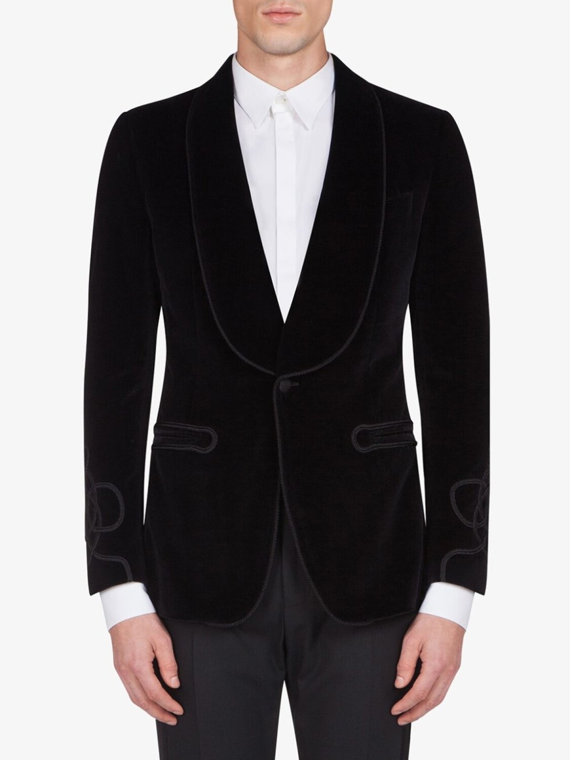 Лацканы-шалька, застежка на пуговицах спереди, два передних кармана с листочкой, длинные рукава и вышитый узор. Цвет: черный.