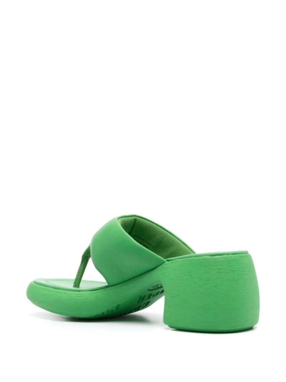 Зеленый, телячья кожа, дутый материал, открытый носок, Т-образный ремешок, стелька OrthoLite Recycled™, логотип на стельке, блочный каблук 71 мм, резиновая подошва, без застежки