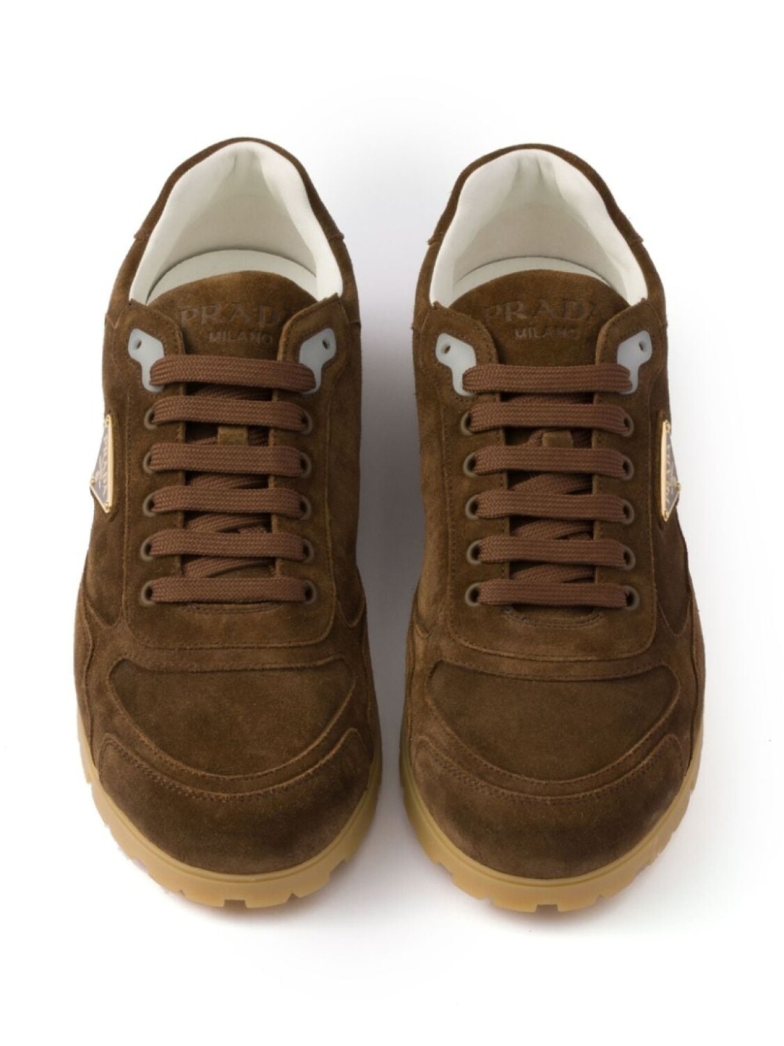 Коричневый, замша, эффект потертости, треугольный эмалированный логотип, тисненый логотип на язычке, логотип на пятке, закругленный носок, шнуровка спереди, кожаная стелька с логотипом, плоская резиновая подошва