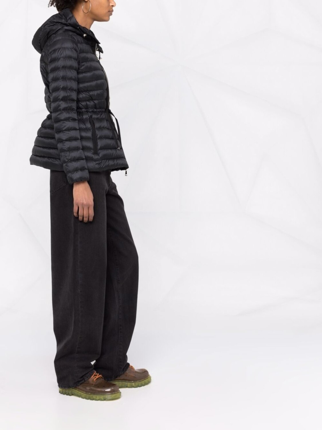 Стеганая модель, дутый материал, нашивка с логотипом на рукаве, затягивающийся на шнурок капюшон, эластичный пояс на шнурке, застежка на молнии спереди, длинные рукава и два передних кармана с листочкой. Цвет: черный.