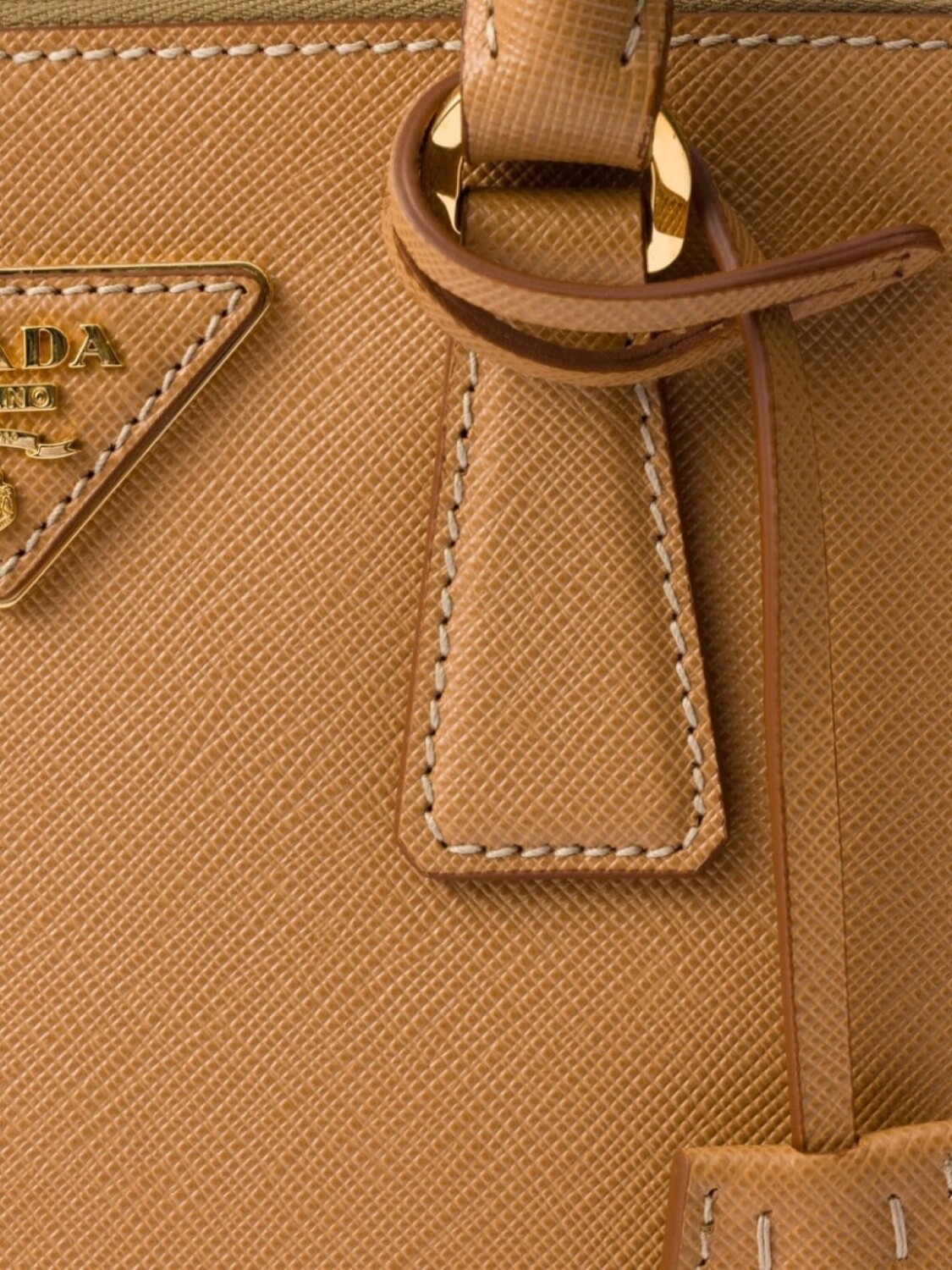 Бежевая сафьяновая кожа эмалированный треугольный логотип брелок для ключей золотистая фурнитура боковая застежка на кнопки регулируемый съемный плечевой ремень две закрученные верхние ручки два отделения на молнии внутренний карман на молнии металлические ножки