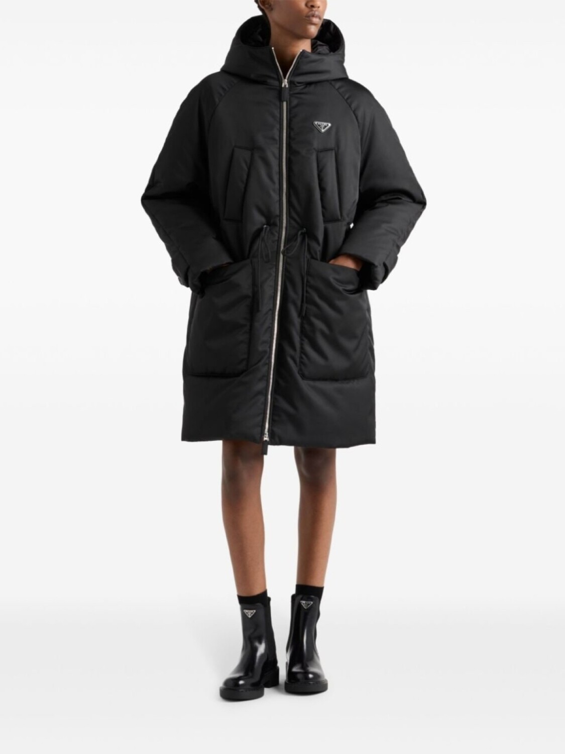 Черный переработанный нейлоновый наполнитель с добавлением пуха и пера, утепленный дизайн, эмалированный треугольный логотип, капюшон на завязках, застежка-молния спереди, длинные рукава реглан, манжеты с поясом, два нагрудных прорезных кармана, два накладных кармана спереди, внутренняя завязка на завязках, талия средней длины, прямой подол