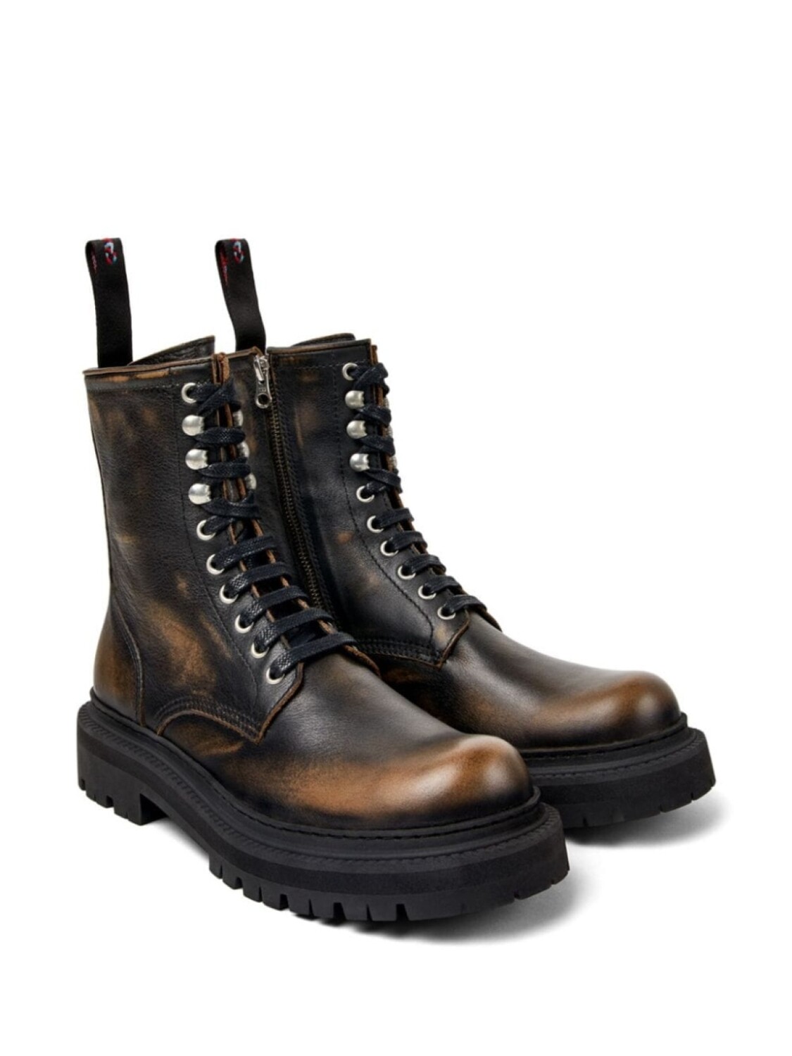 Коричневый/черный, кожа, гладкая текстура кожи, эффект потертости, отделка металлическими люверсами, закругленный носок, шнуровка спереди, застежка на молнии сбоку, кожаная стелька с логотипом, ребристая резиновая подошва