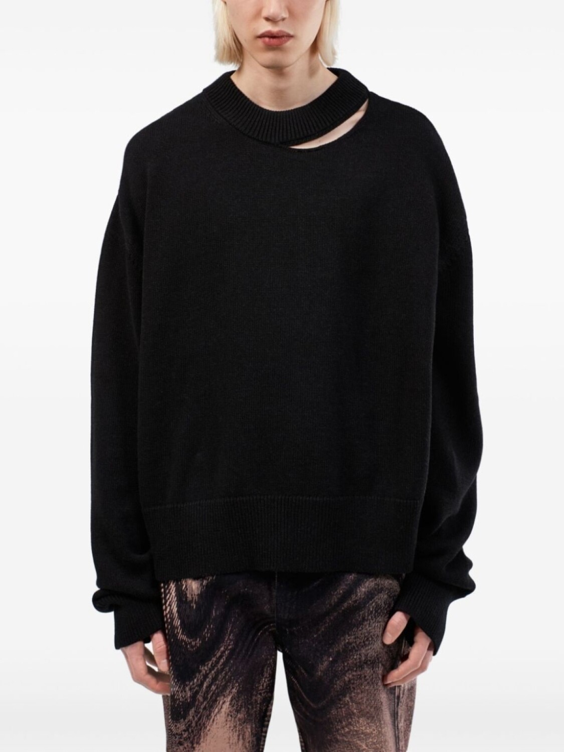 Черный с эффектом потертости, вырезы, ребристые манжеты и подол, длинные рукава, прямой подол, круглый вырез горловины