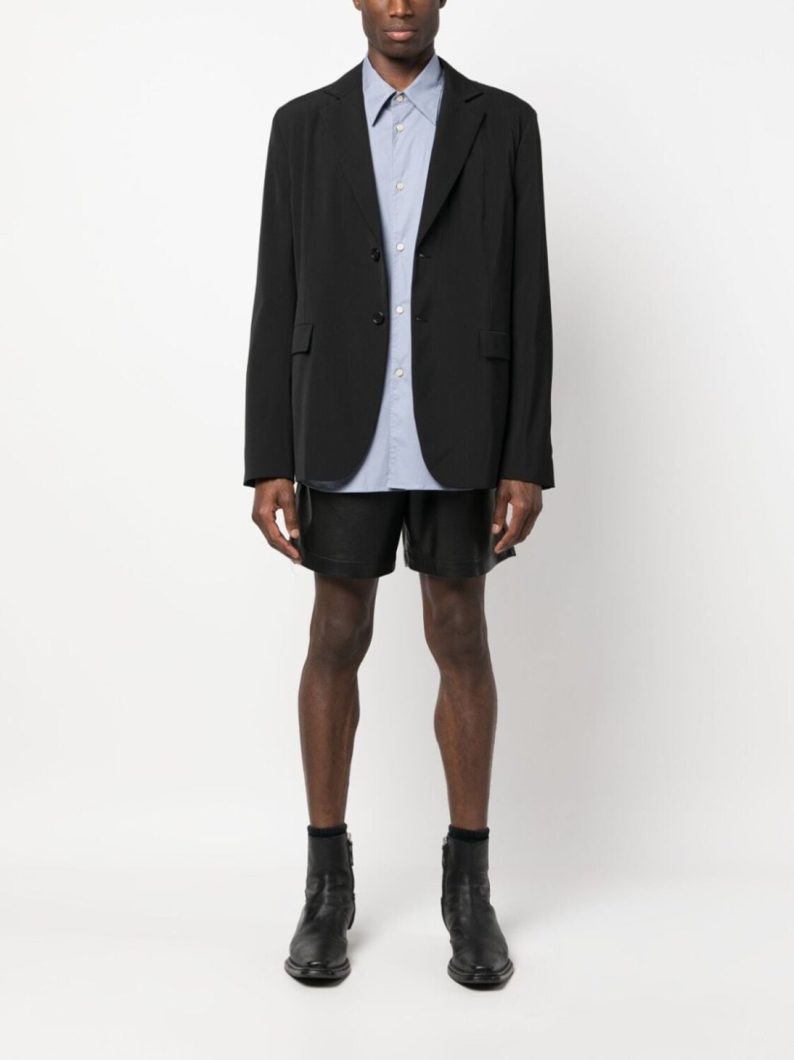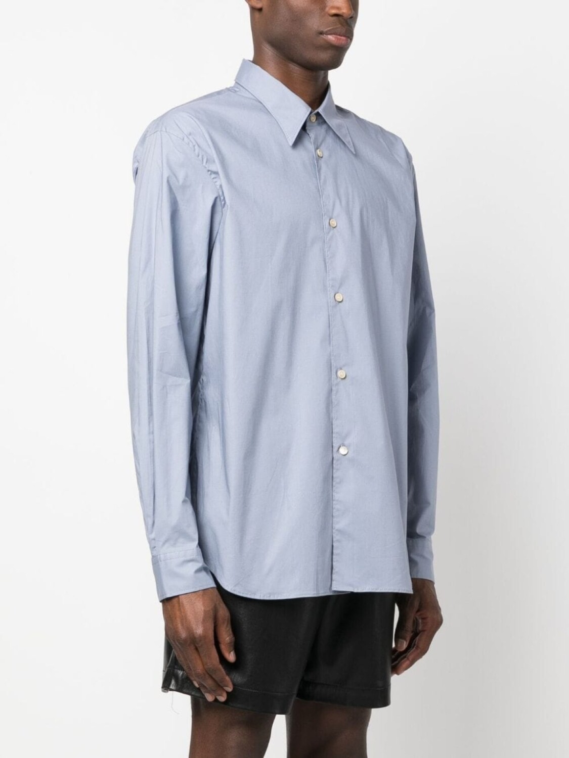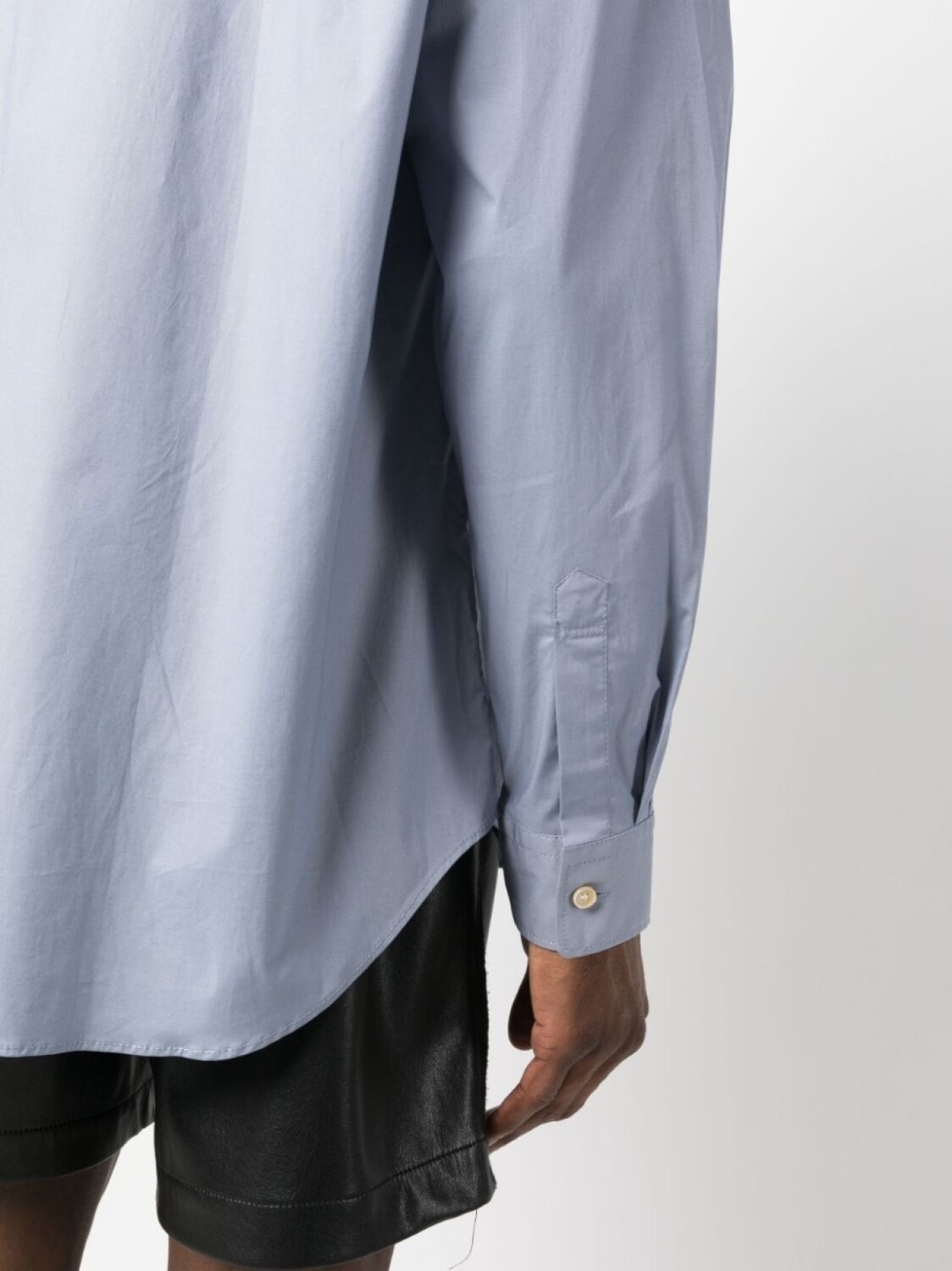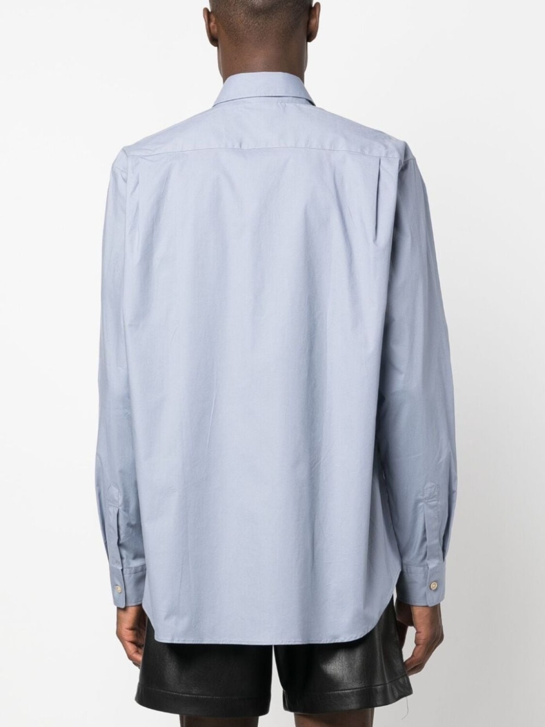 Пудрово-голубой, эластичный хлопок, классический воротник, застежка на пуговицах спереди, длинные рукава и закругленный подол.