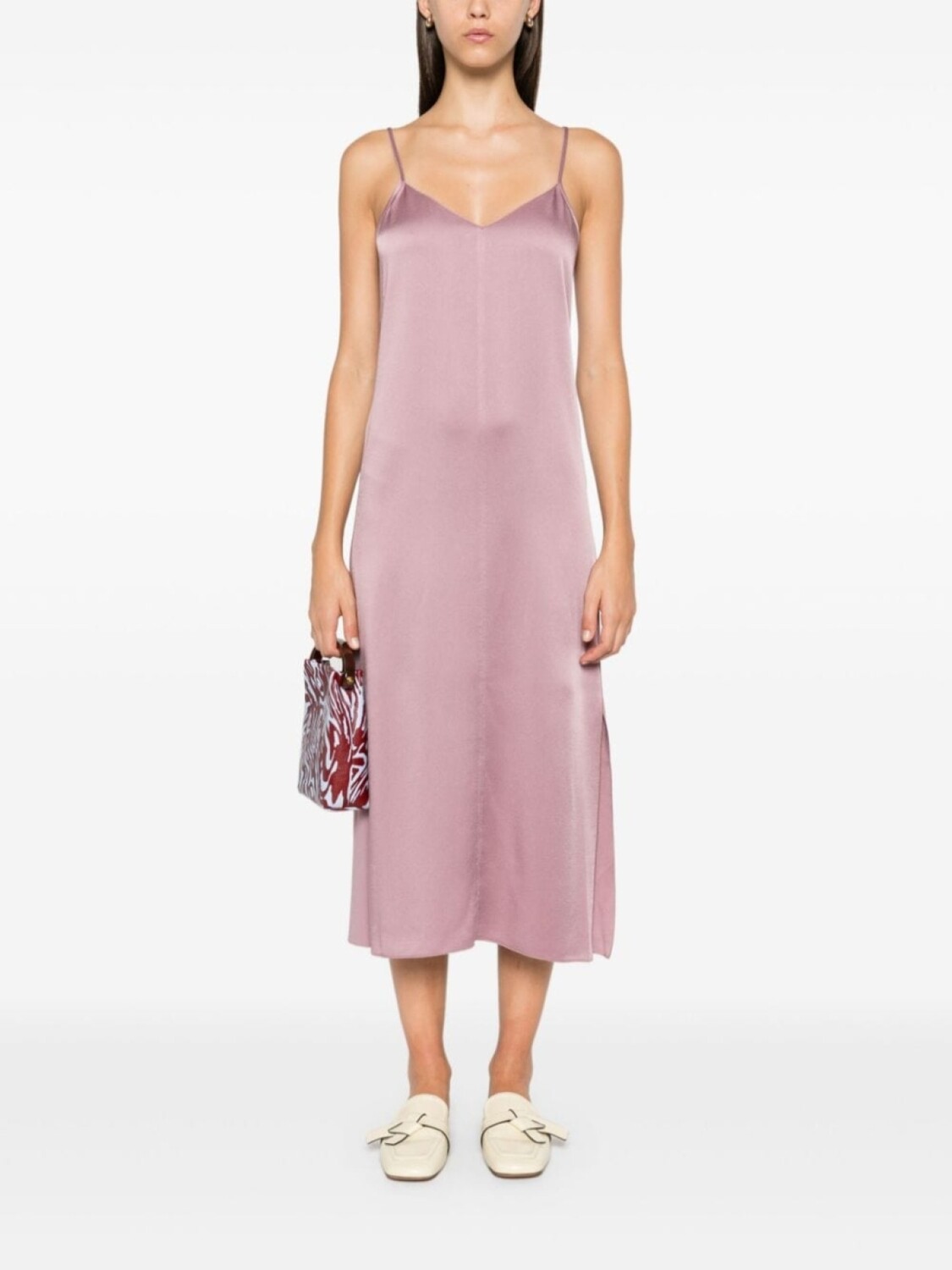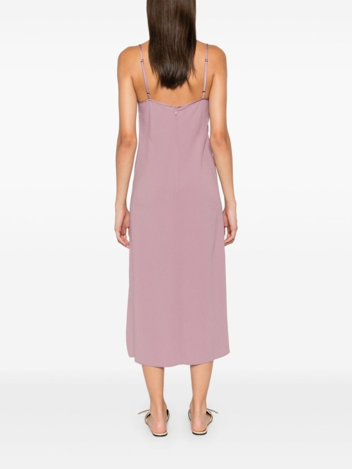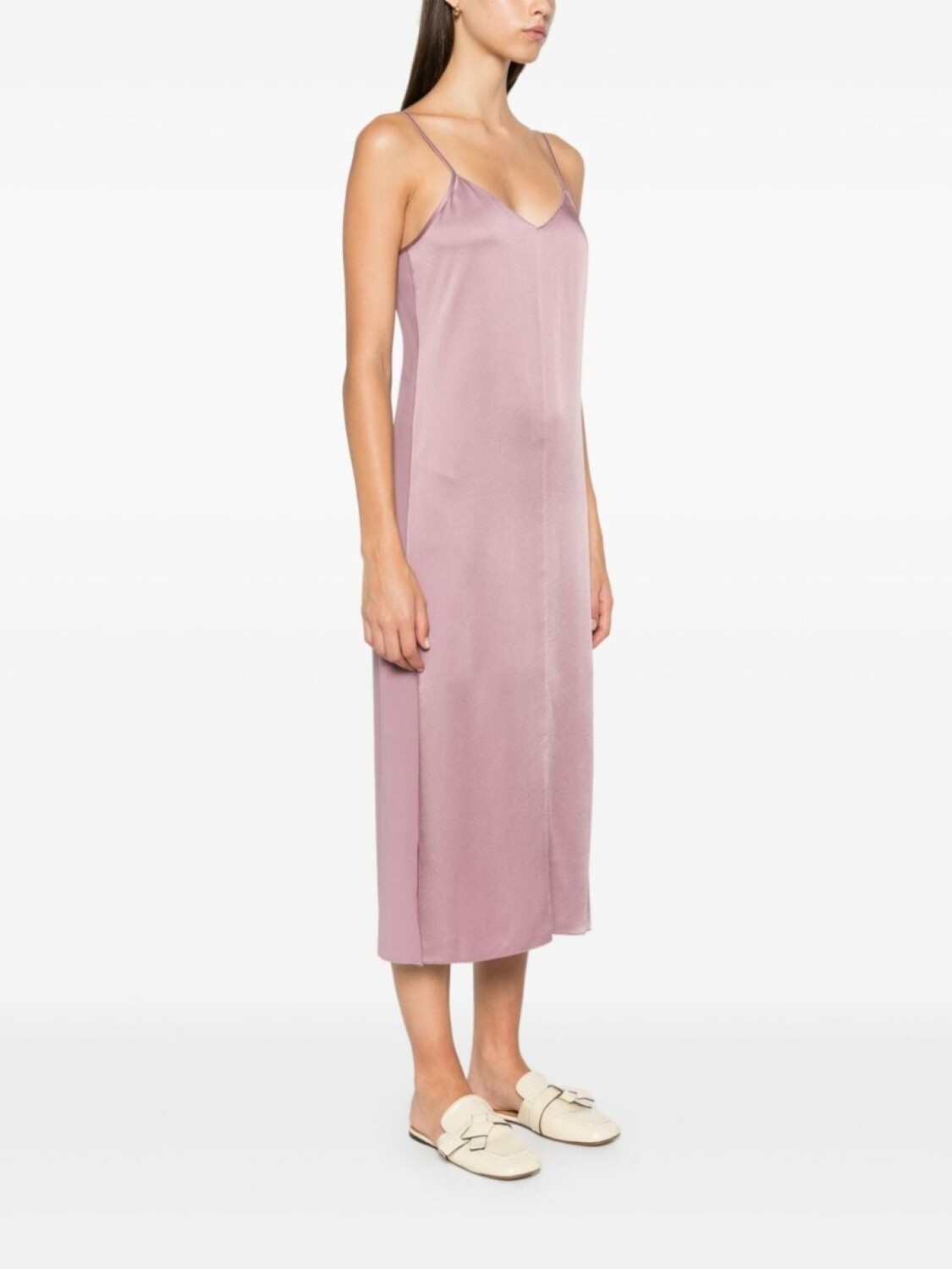 Лиловый атлас, потайная застежка-молния сзади, V-образный вырез, регулируемые тонкие бретели, разрезы по бокам, свободный силуэт, прямой подол, средняя длина
