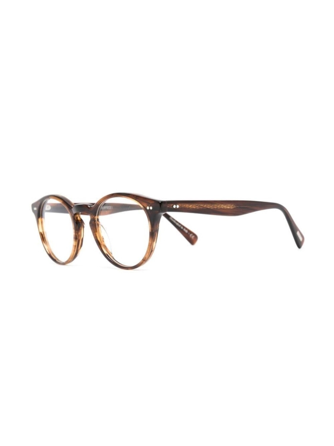 Коричневый, круглая оправа, прозрачные линзы, прямые дужки и дужки с закругленными концами. Обратите внимание, что на FARFETCH продаются оправы с линзами без диоптрий. В комплект входит защитный чехол для очков.