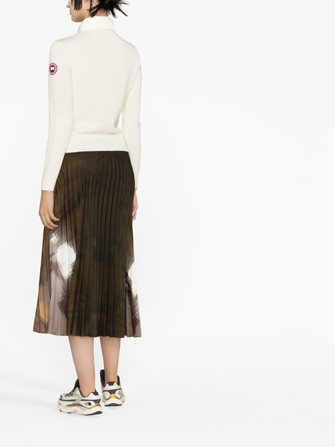 Кремово-белый, шерсть, гусиный пух, стеганая модель, трикотажный материал, воротник-стойка, нашивка с логотипом на рукаве, застежка на молнии спереди и прямой подол.