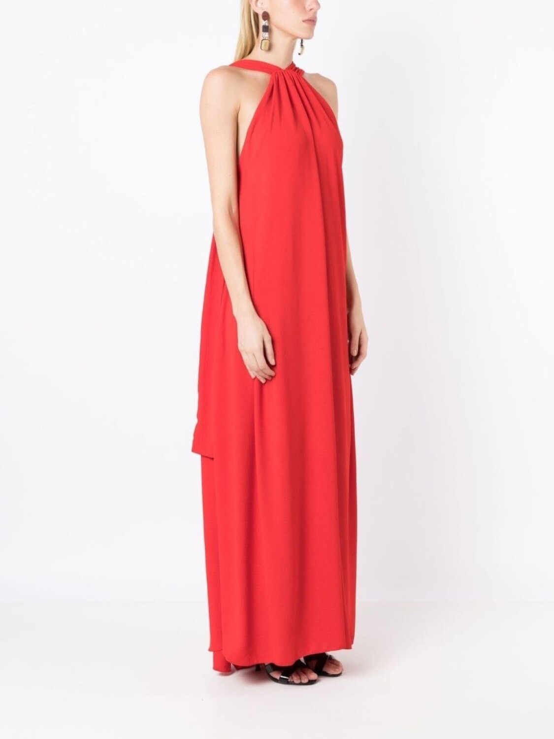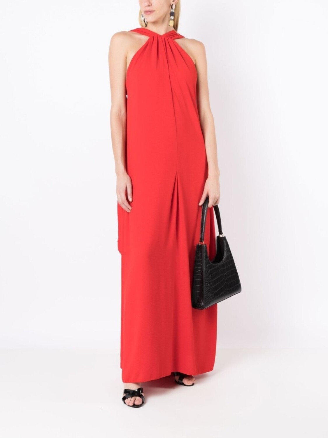 Красный, складки, вырез-петля халтер, U-образный вырез на спине, застежка на завязке сзади и длина макси.