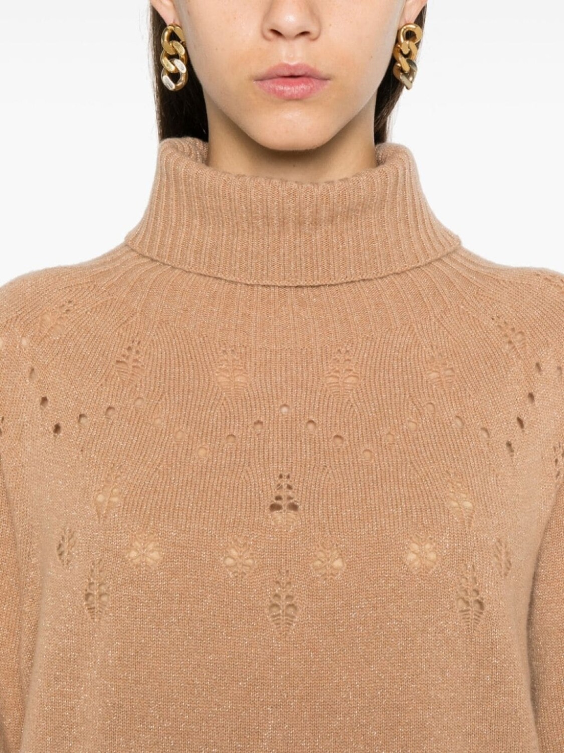 Светло-коричневый, смесовая шерсть, тонкая вязка, вставки из люрекса, высокий воротник, длинные рукава, манжеты в рубчик, разрезы по бокам, подол в рубчик