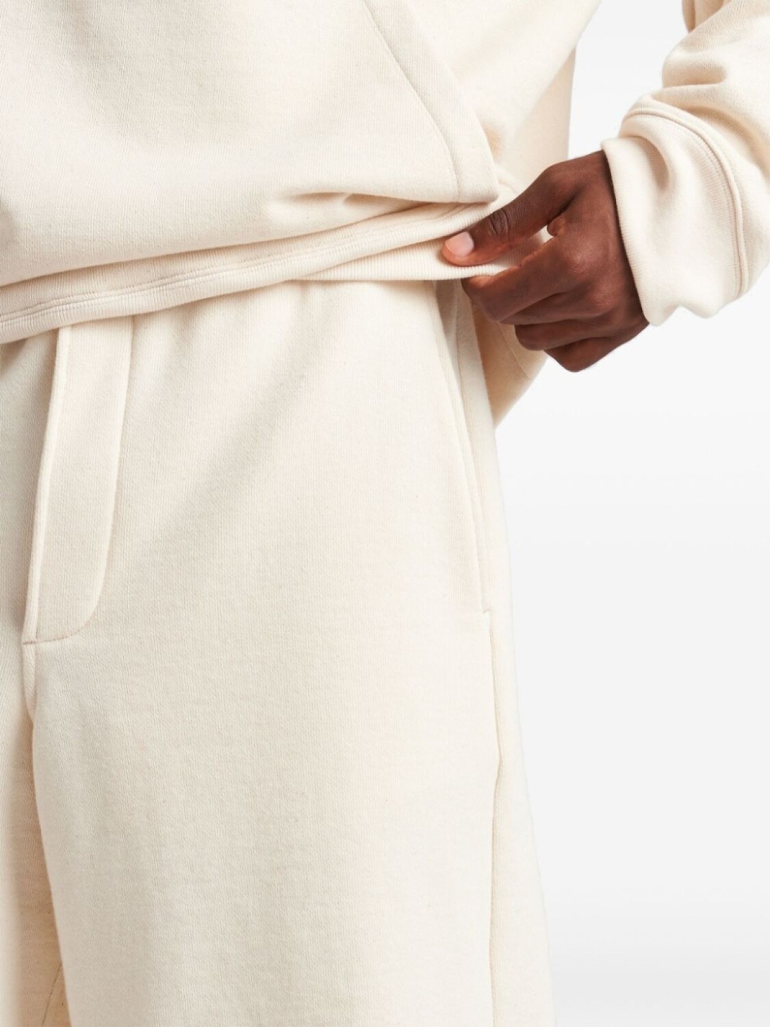 Экрю, хлопок, эластичный пояс на шнурке, два кармана по бокам, карман на молнии сзади, треугольный эмалированный логотип сзади, длина до бедер, подкладка из футера