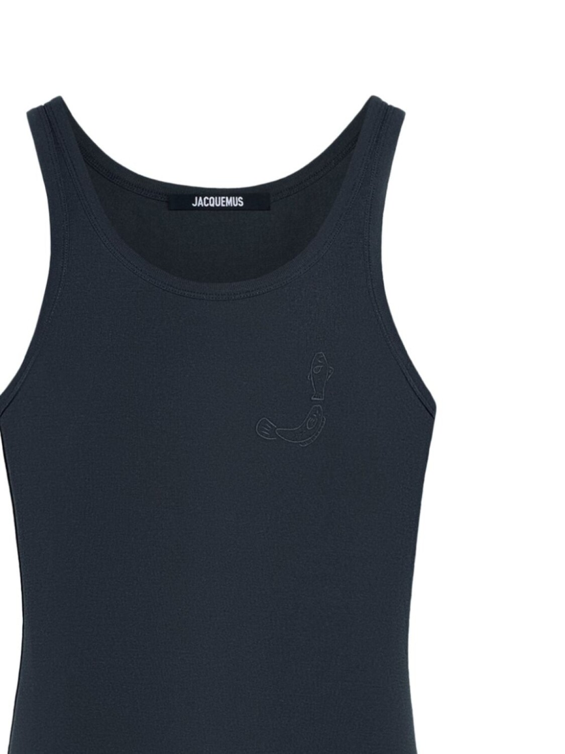 Темно-синий хлопковый трикотаж в рубчик с вышитым мотивом «Рыбак» на груди, нашивка с логотипом сзади, круглый вырез горловины, без рукавов, прямой подол