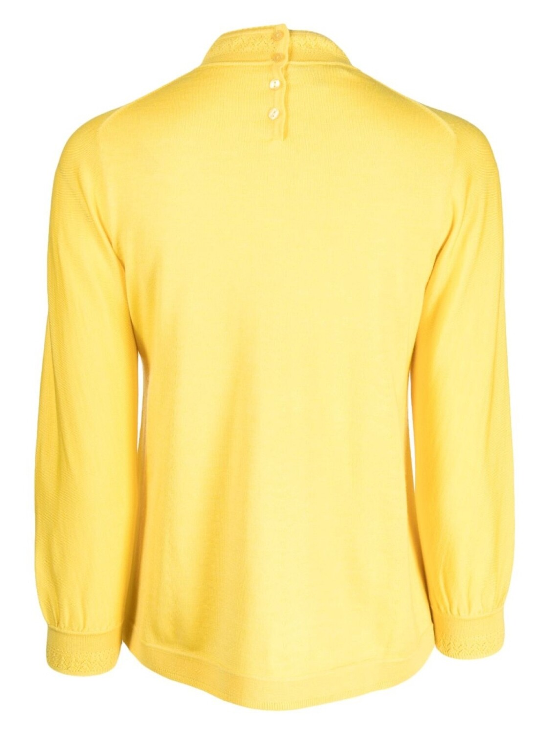 Бело-желтый, шерсть мериноса, смесовый шелк, цветочный принт спереди, воротник-стойка, застежка на пуговицы сзади, длинные рукава, эластичные манжеты и прямой подол.