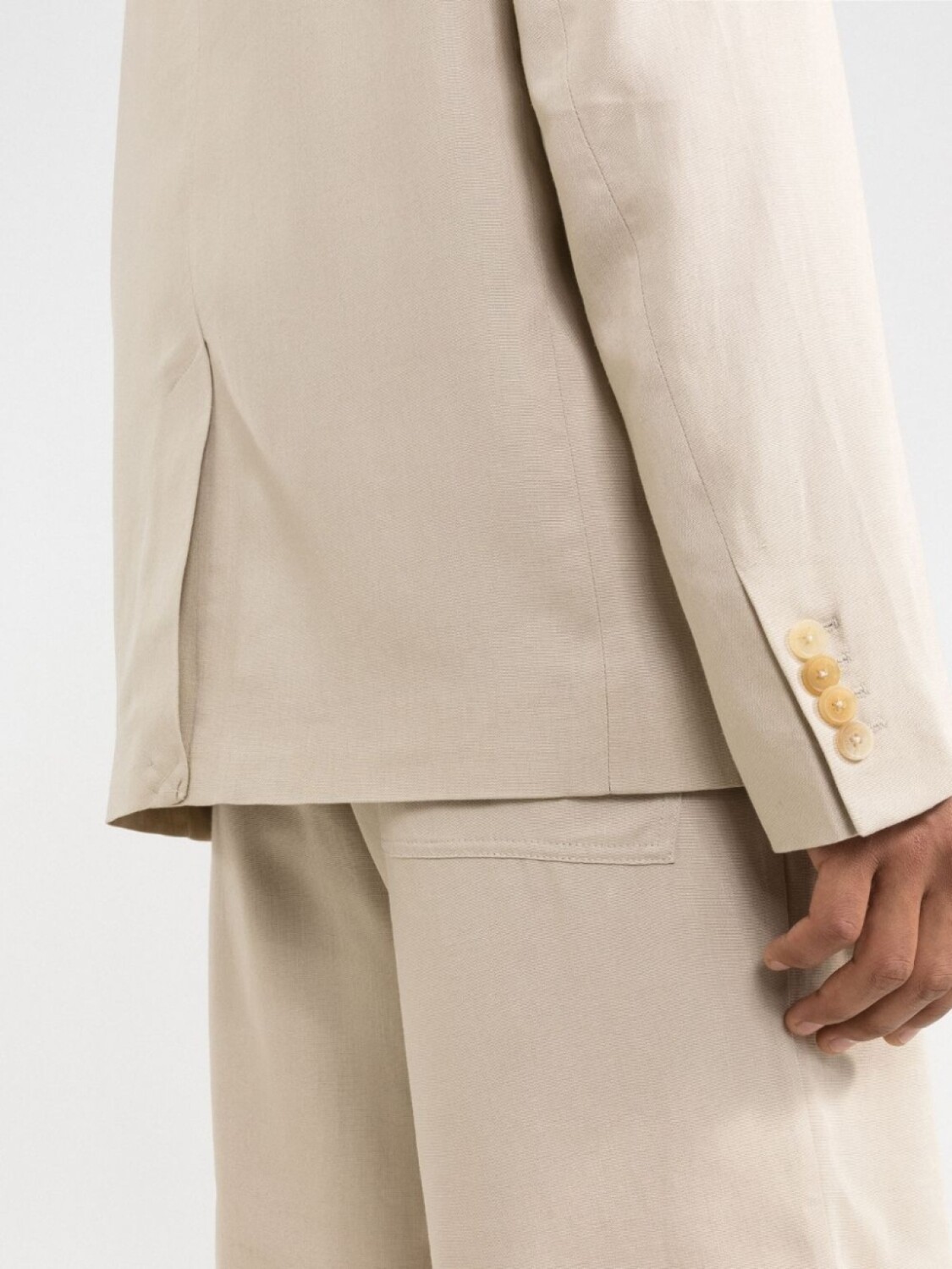 Зазубренные лацканы, застежка на пуговицах спереди, прорезной карман на груди, два передних кармана с клапанами, длинные рукава, манжеты на пуговицах и вырез сзади.