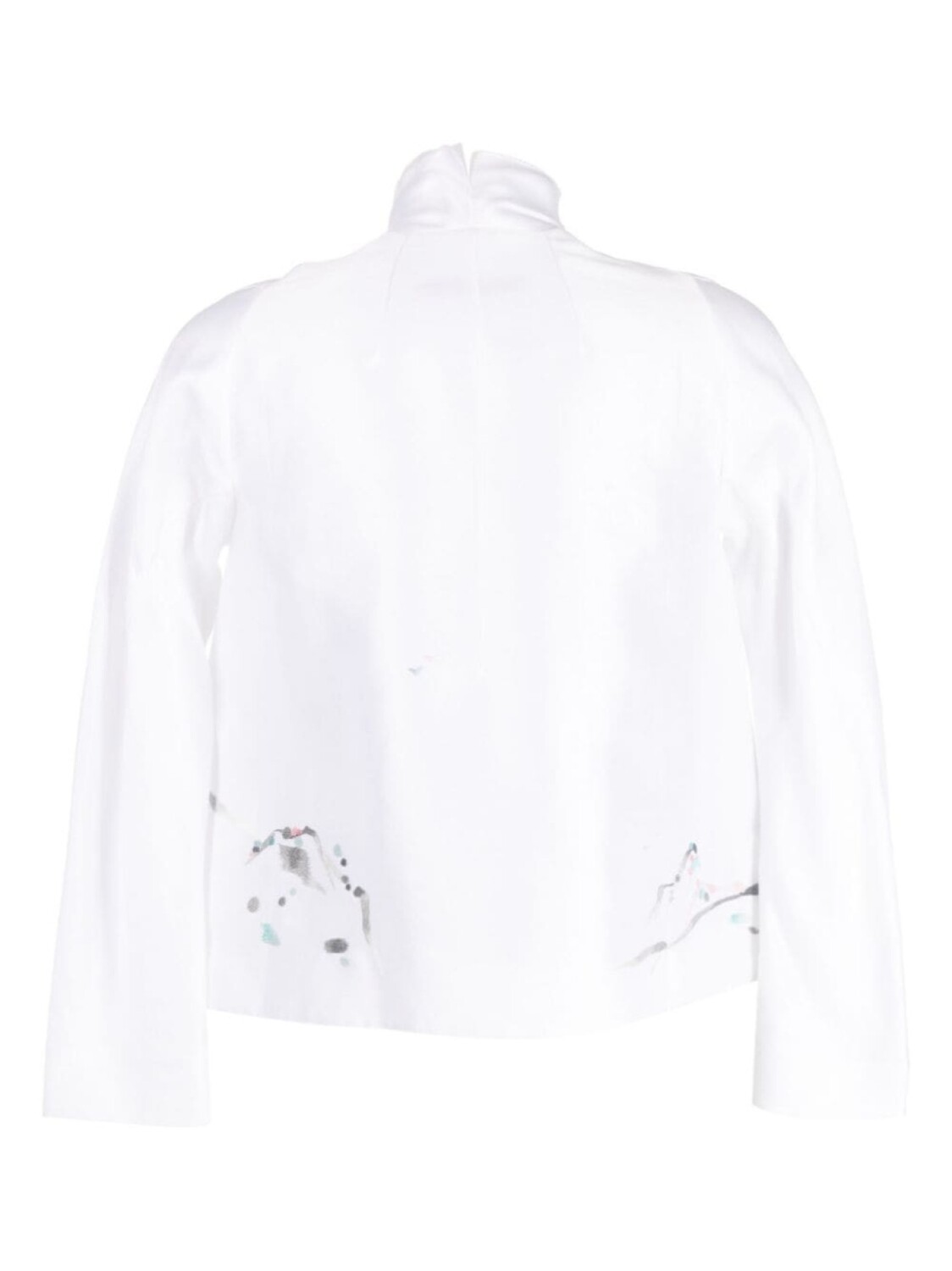 Белый, смесь хлопка и шелка, цветочный принт спереди, воротник-стойка, потайная застежка спереди, длинные рукава и прямой подол.