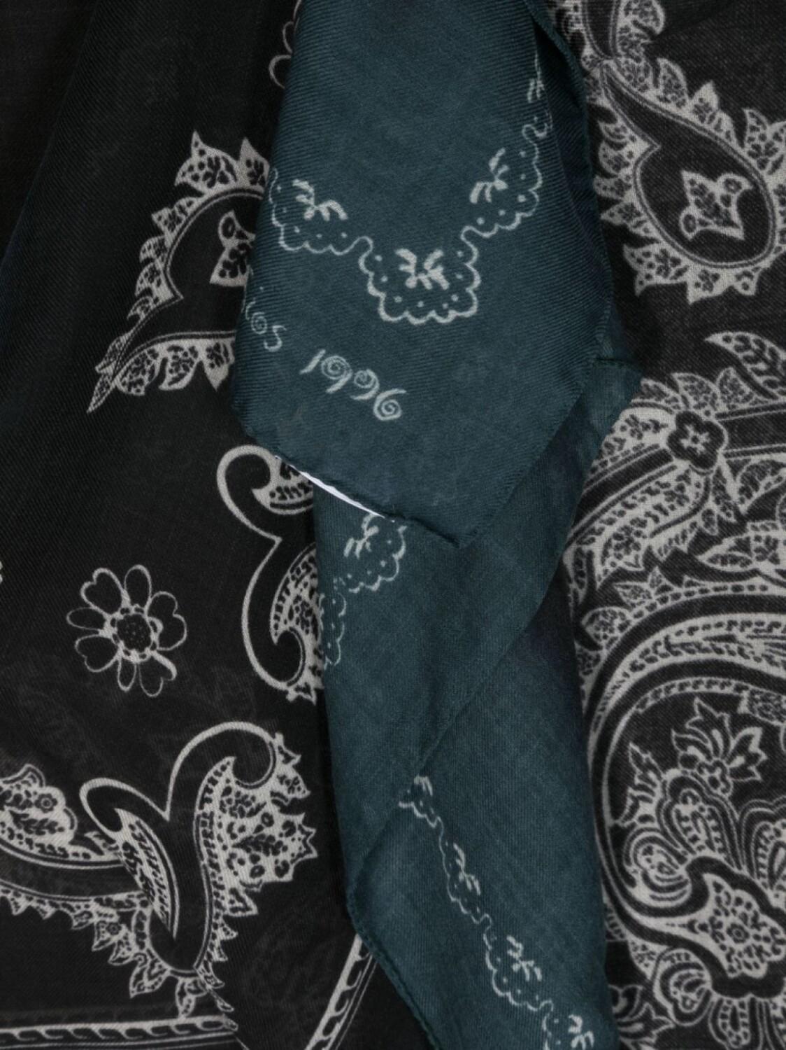 Сине-зеленый, черный, шерсть, принт пейсли, контрастные края, логотип на подоле, квадратная форма и несколько оборотов.