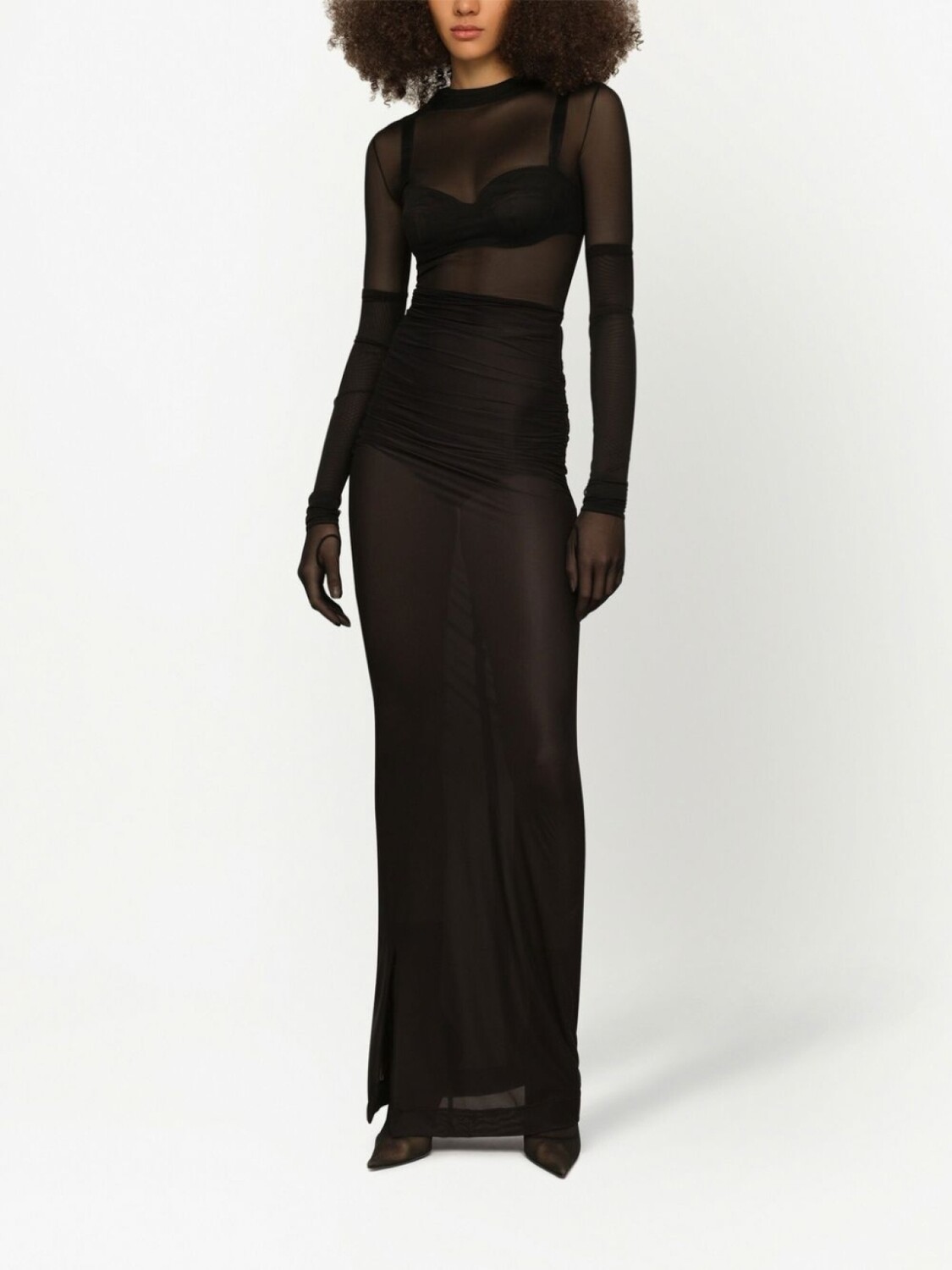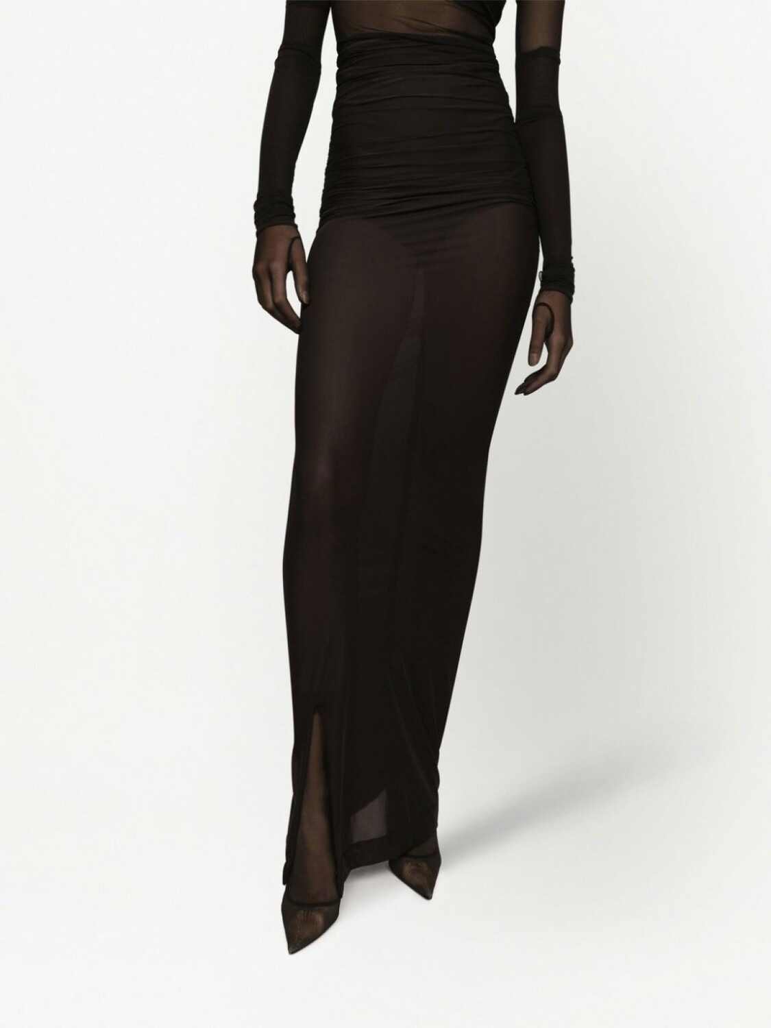 Черный, эластичный материал, прозрачный материал, завышенная линия талии, разрез спереди и длина макси.