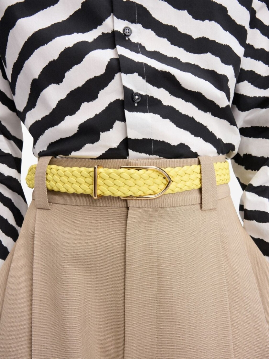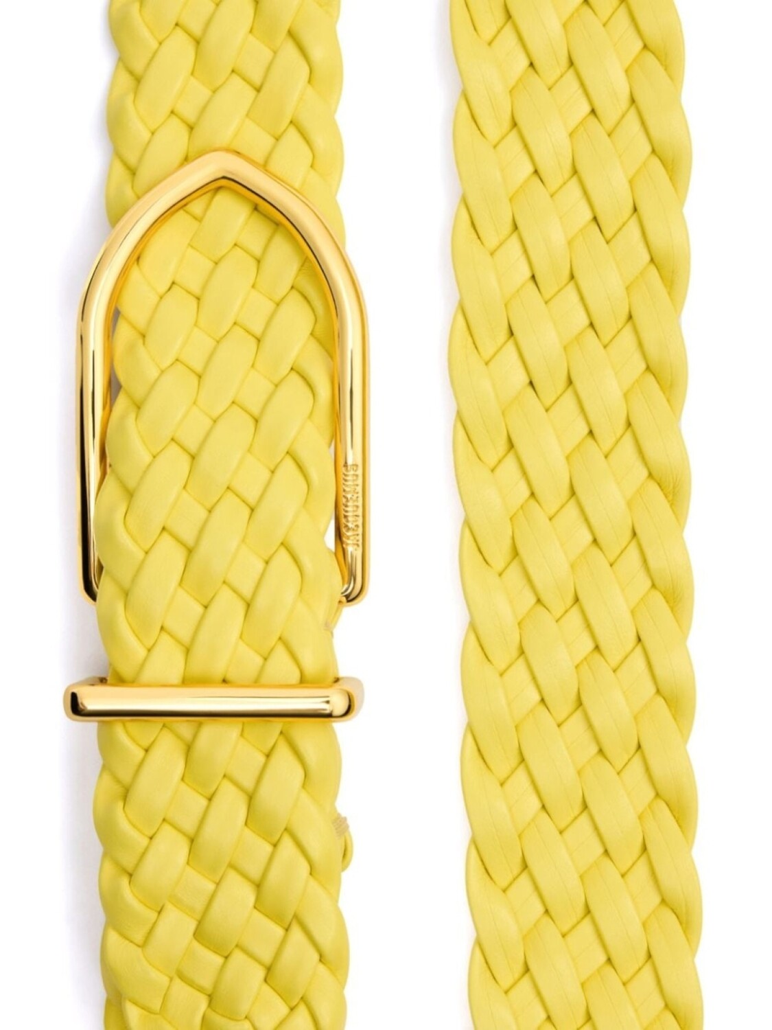 Желтый, телячья кожа, переплетенный дизайн, пряжка с выгравированным логотипом, золотистая фурнитура, застежка на пряжке, регулируемый дизайн