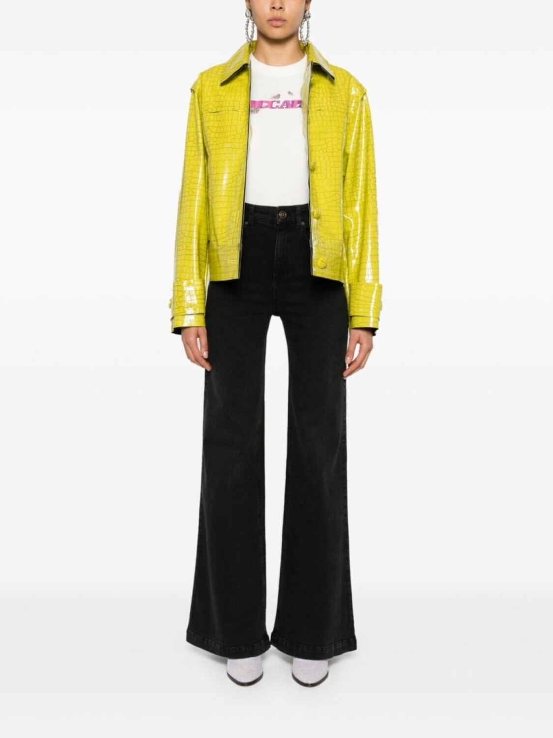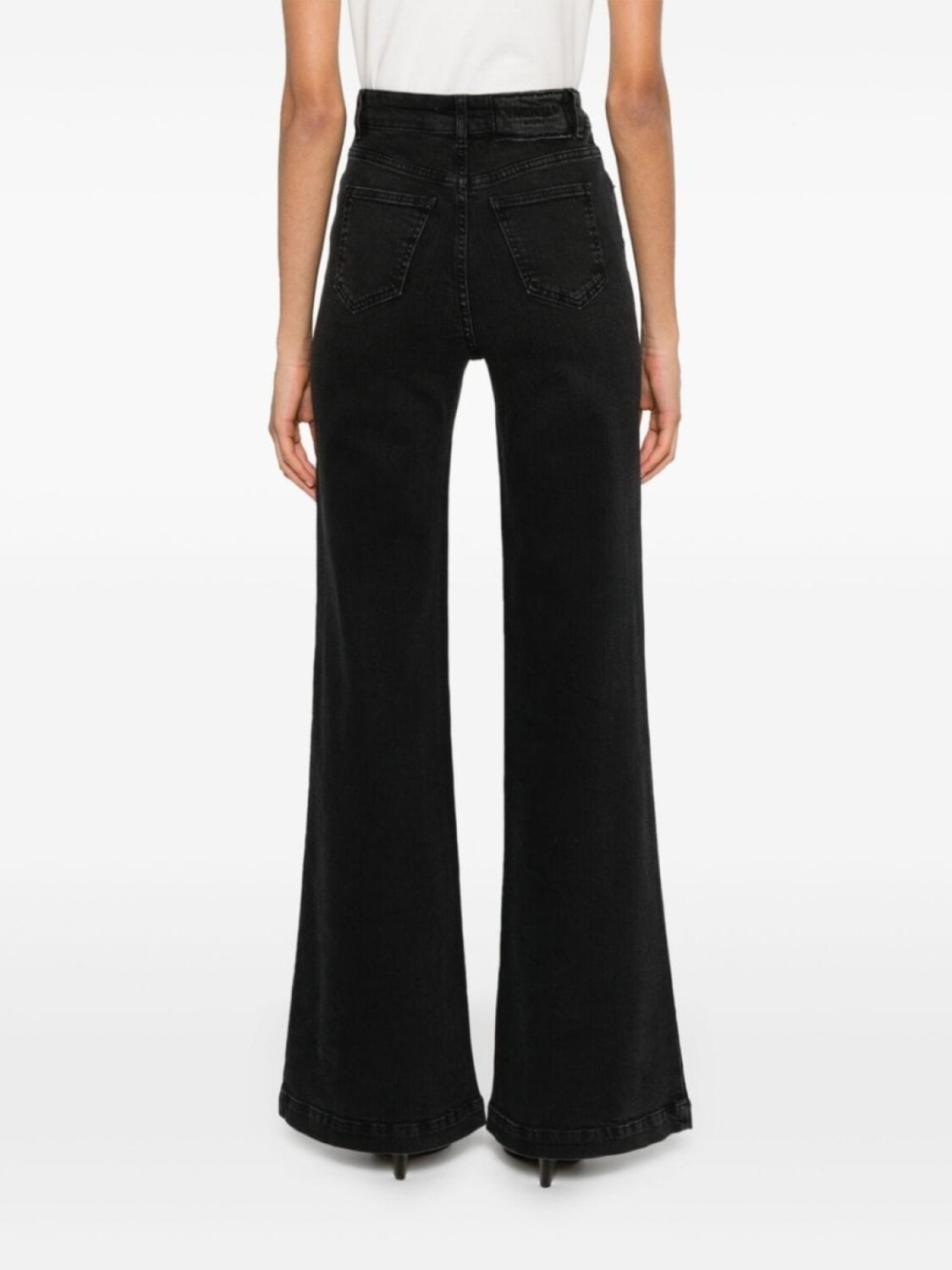 Черный, смесовый хлопок, деним, завышенная талия, петли для ремня, классическая пятикарманная модель, нашивка с логотипом сзади, расклешенный крой, потайная застежка на молнии и пуговицах