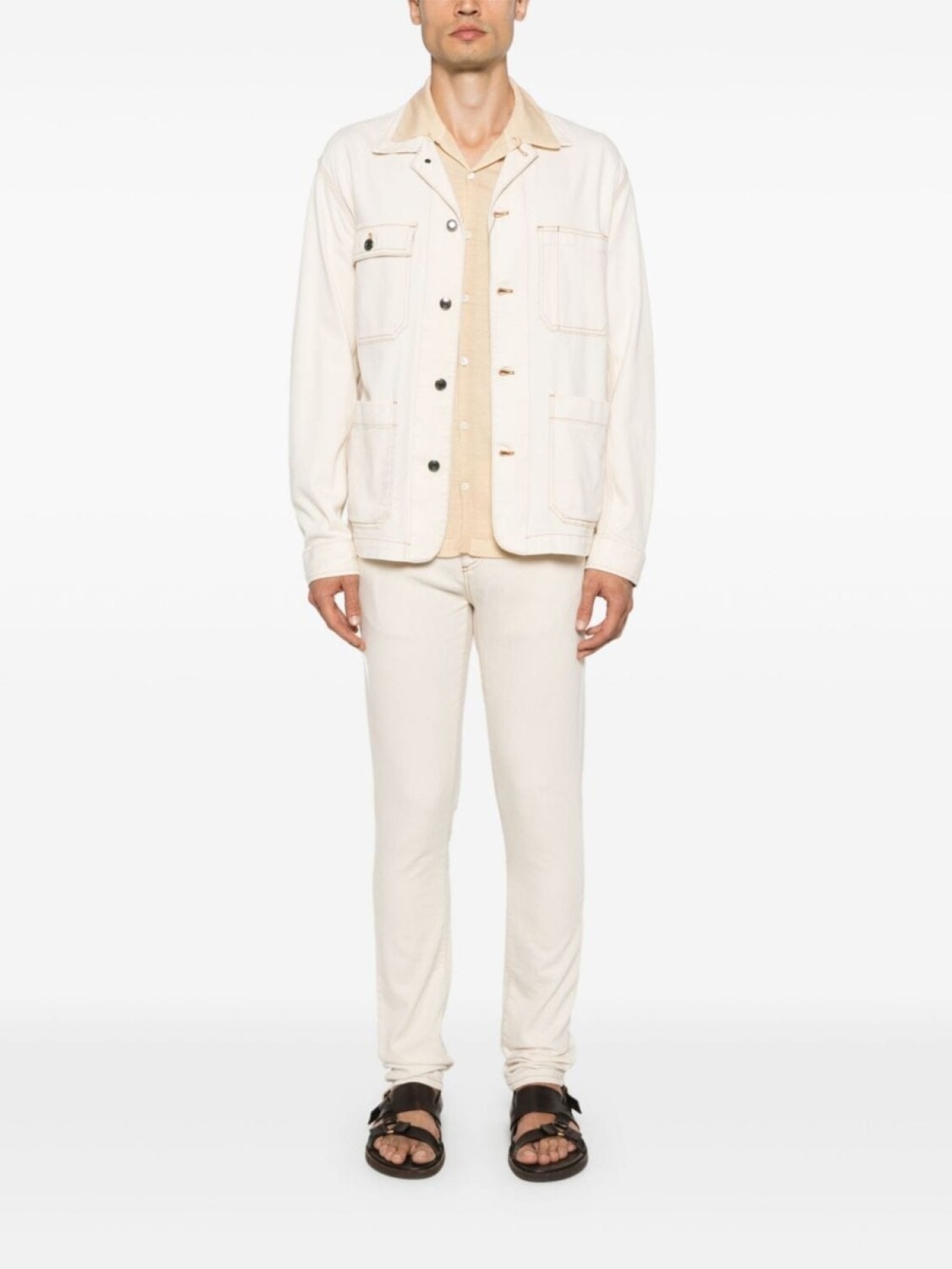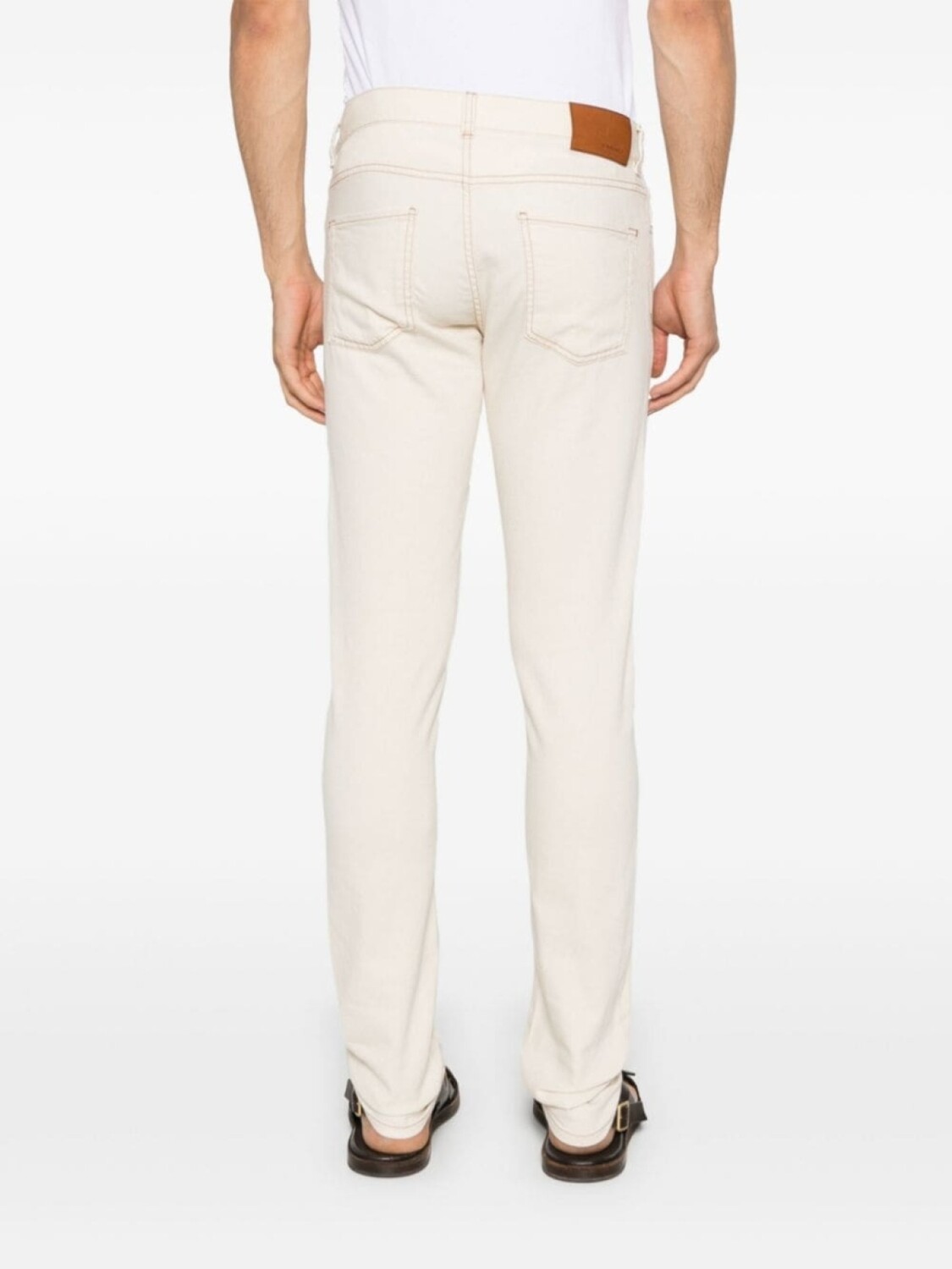 Светло-бежевый хлопковый твил, нашивка с логотипом сзади, застежка на молнию и пуговицы, шлевки для ремня, узкий крой, классические пять карманов