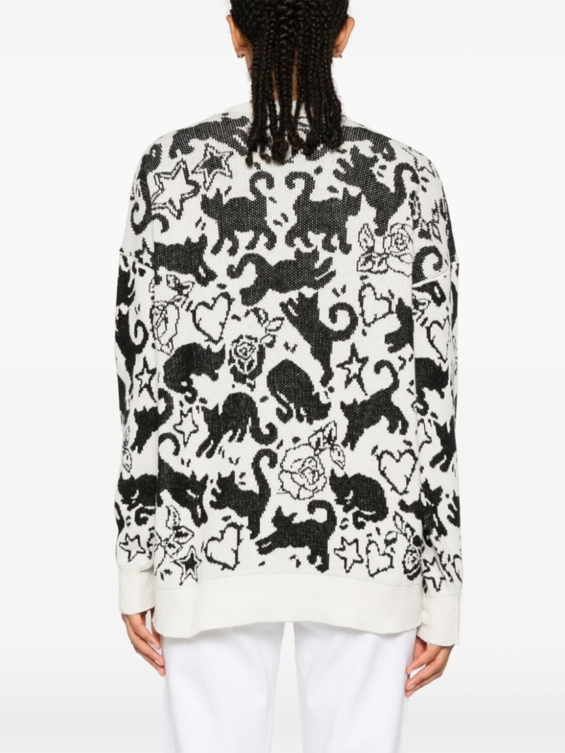 Белый/черный трикотажный узор «кошки-жаккард», круглый вырез горловины, длинные рукава, ребристые манжеты и низ
