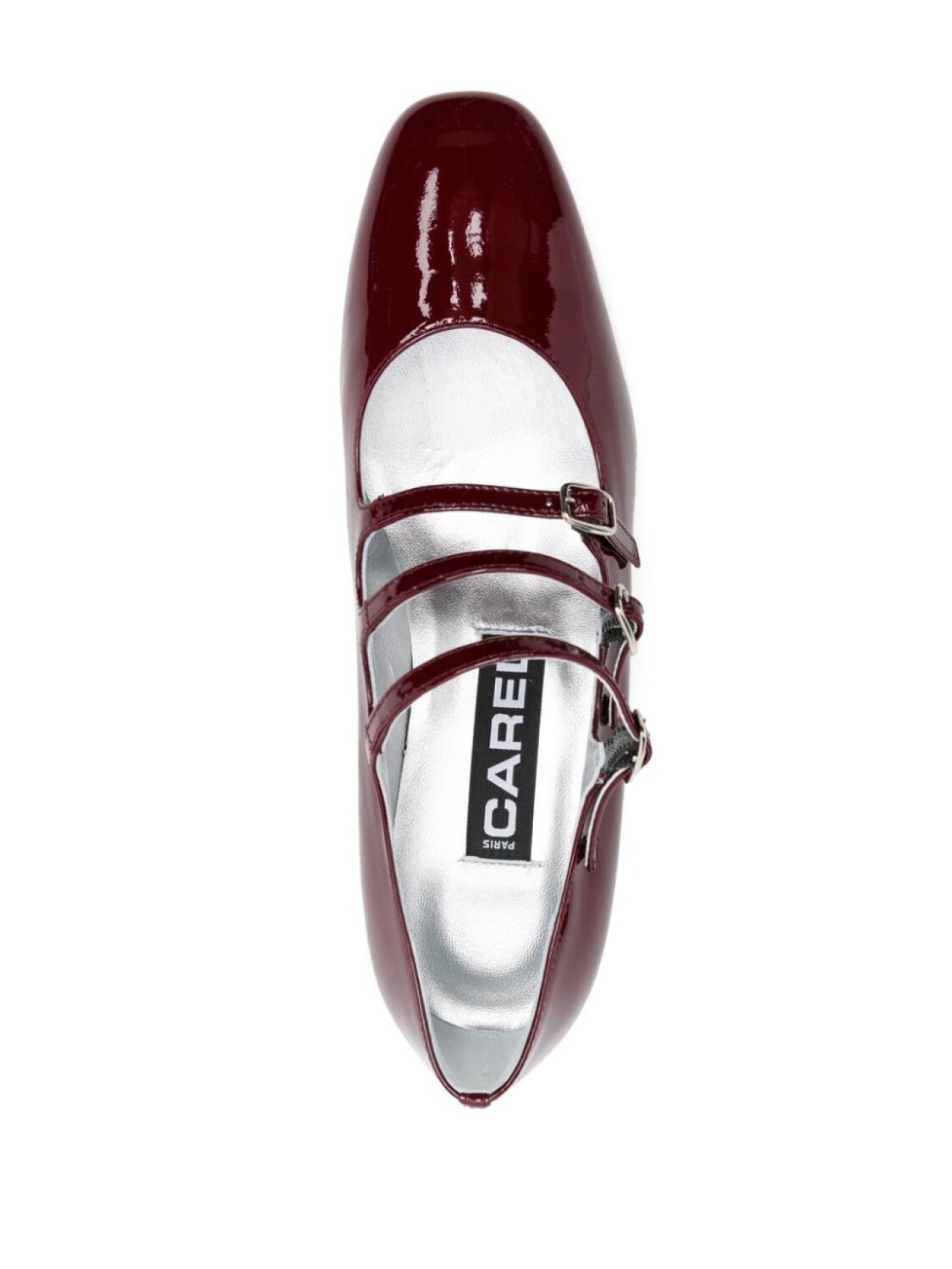 Бордовый, телячья кожа, лакированная отделка, застежка с пряжкой спереди, закругленный носок и низкий блочный каблук.