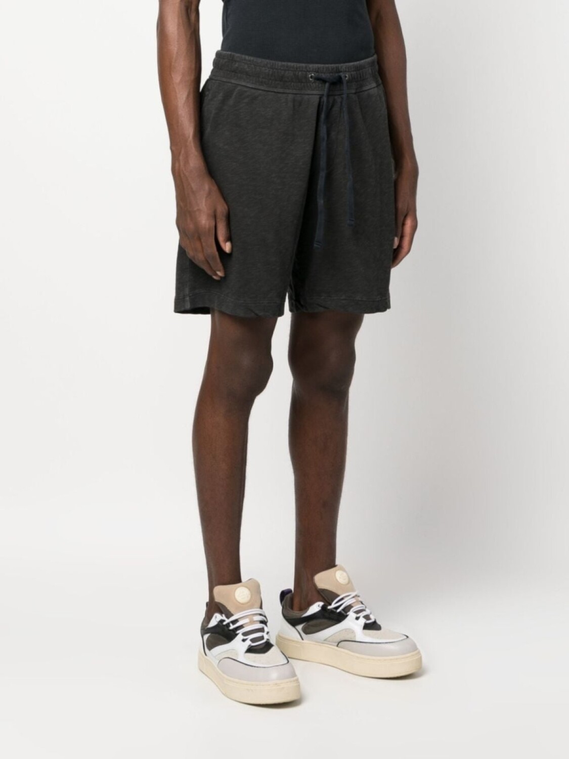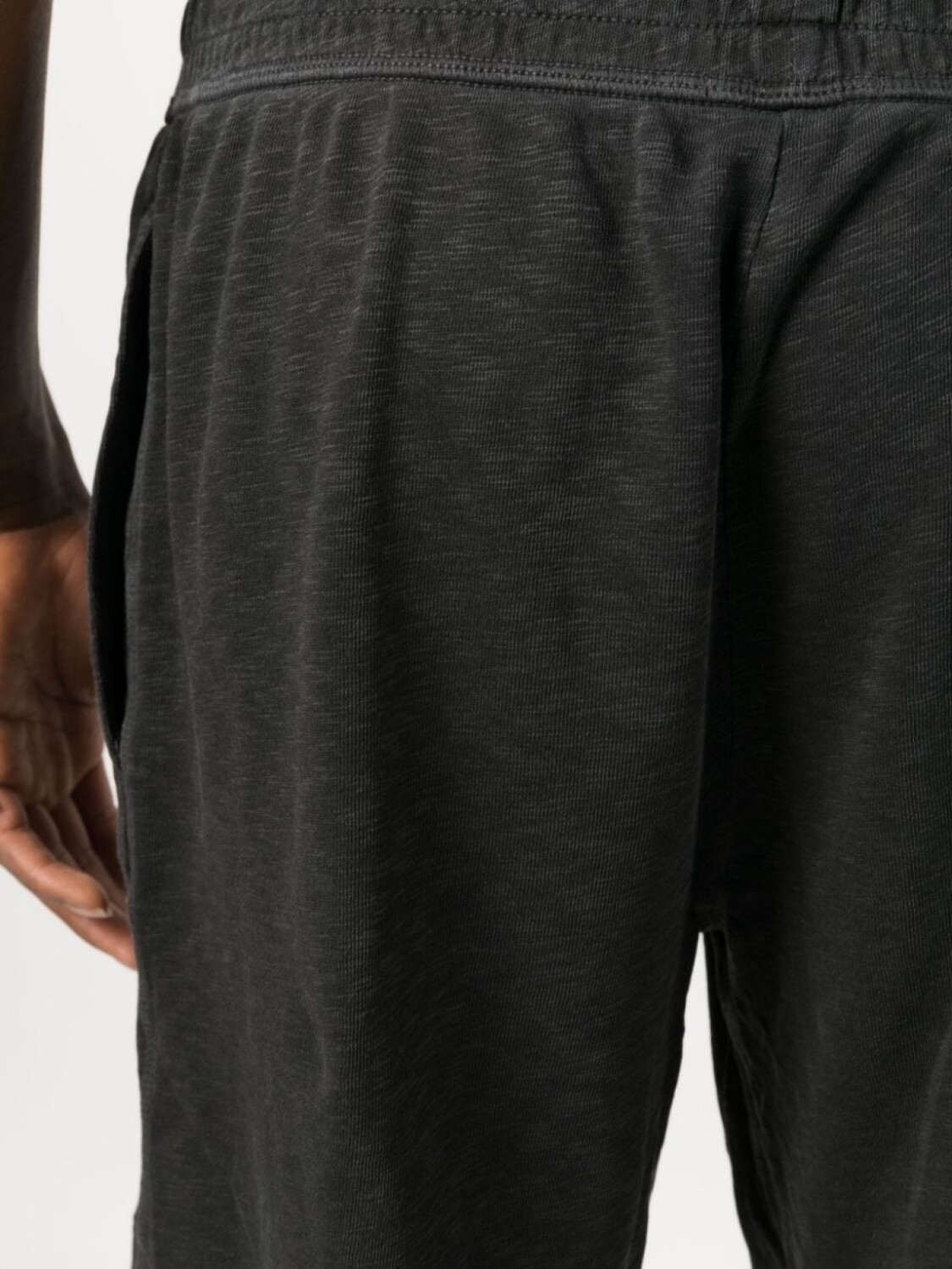 Черный, хлопок Supima, эффект меланж, кулиска на талии, прямой крой и два вшитых кармана по бокам.