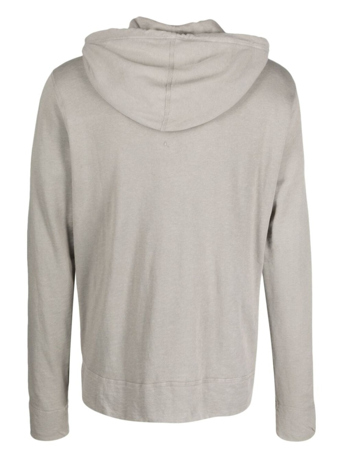 Светло-серый, хлопок Supima, затягивающийся на шнурок капюшон, длинные рукава, застежка на молнии спереди, два передних кармана и прямой подол.