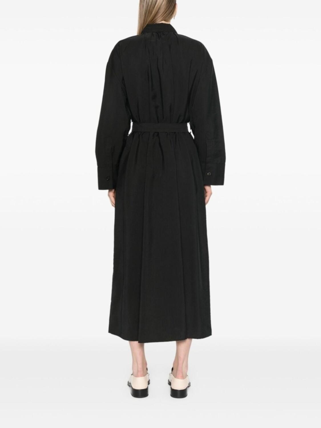 Черный, смесовый лиоцелл, застежка на пуговицах спереди, классический воротник, приспущенные плечи, длинные рукава, манжеты на пуговицах, прорезной карман на груди, съемный пояс, петли для ремня, билетный карман, два прорезных кармана по бокам, модель без подкладки, прямой подол, длина макси, Этот товар как минимум на 50% состоит из материалов, которые признаны более безопасными для окружающей среды, и/или произведены с использованием методов, которые помогают сократить потребление воды и химических веществ., Узнать больше о том, какие товары получают отметку «Ответственный выбор», можно здесь.
