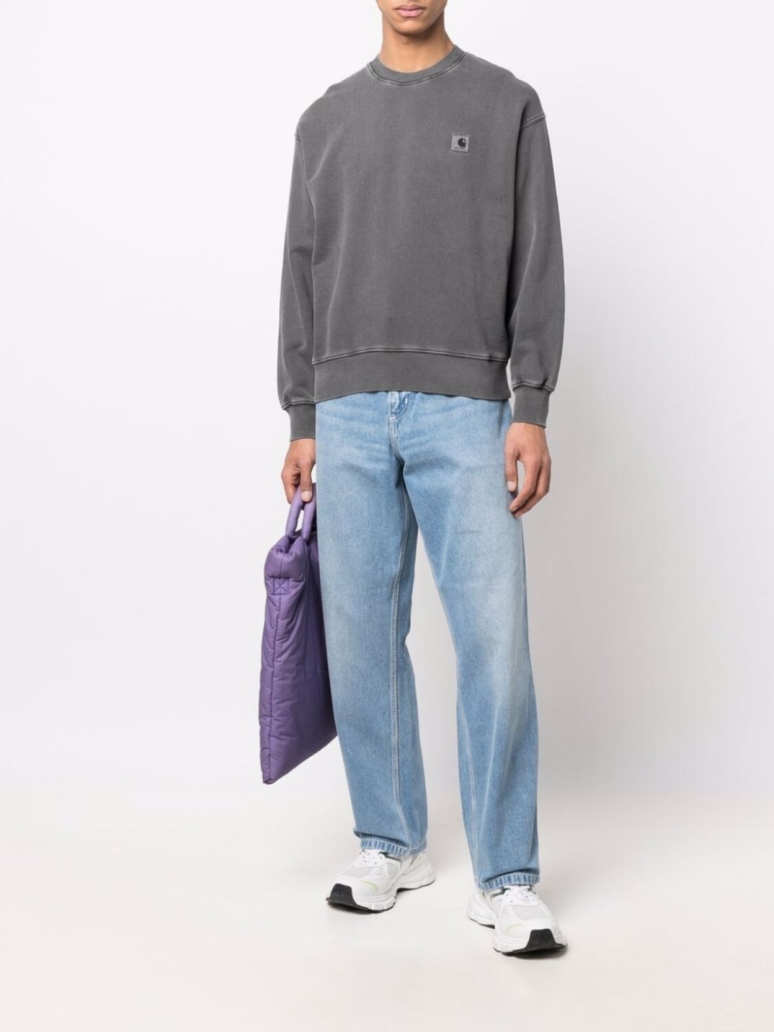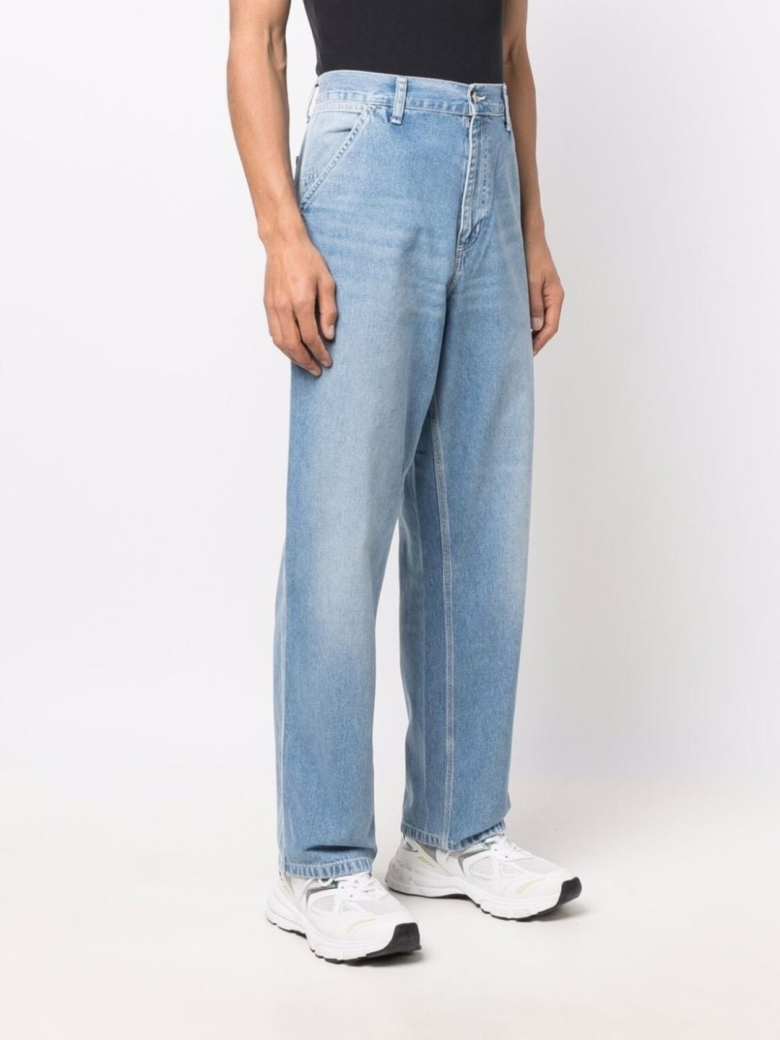 Обработанный деним, нашивка с логотипом сзади, прямой крой, средняя посадка, два кармана по бокам, два накладных кармана сзади, потайная застежка на молнии и пуговицах и петли для ремня.
