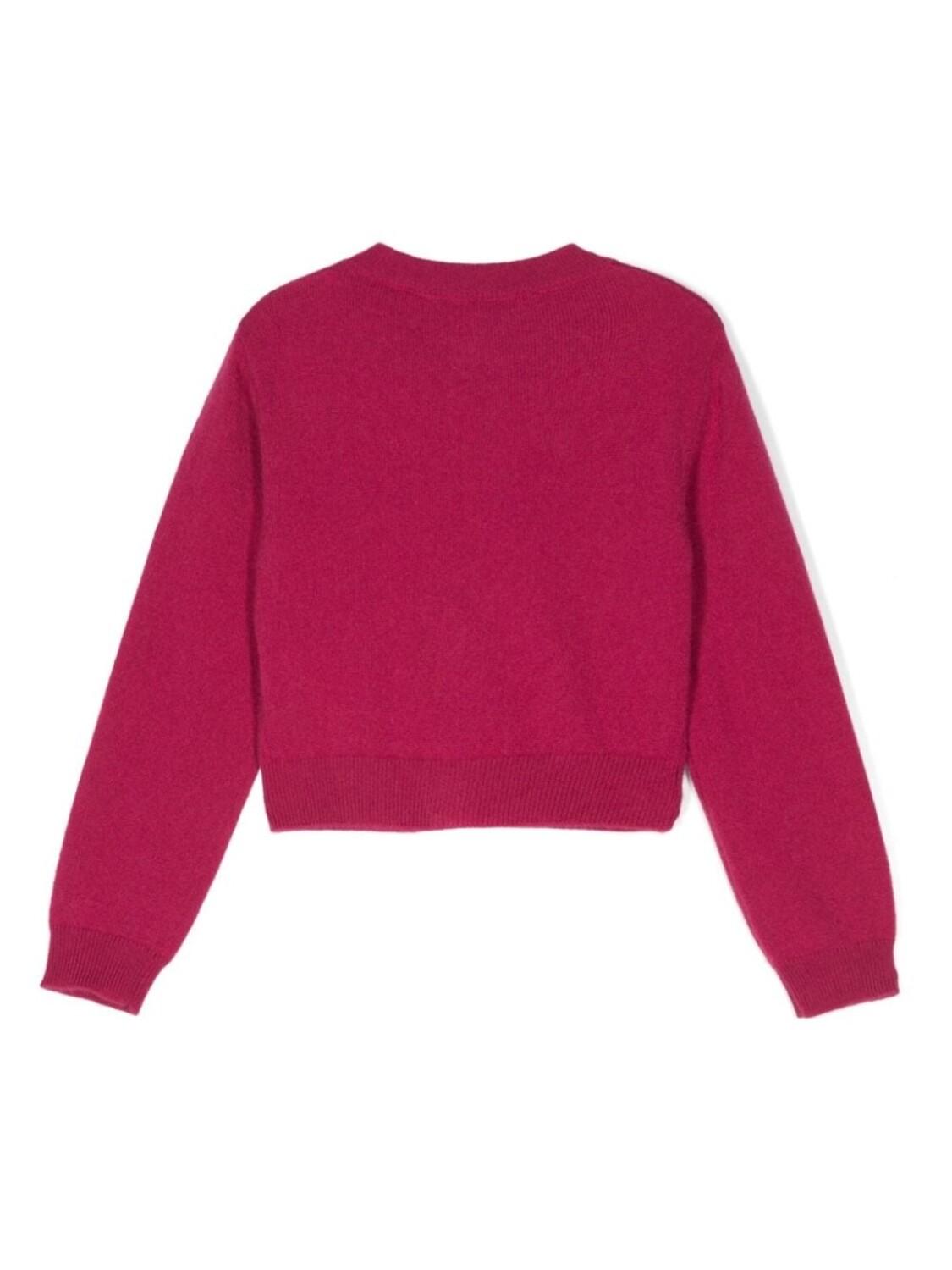 Темно-розовый кашемировый трикотаж, отделка в рубчик, круглый вырез, длинные рукава, прямой подол, застежка на пуговицы спереди