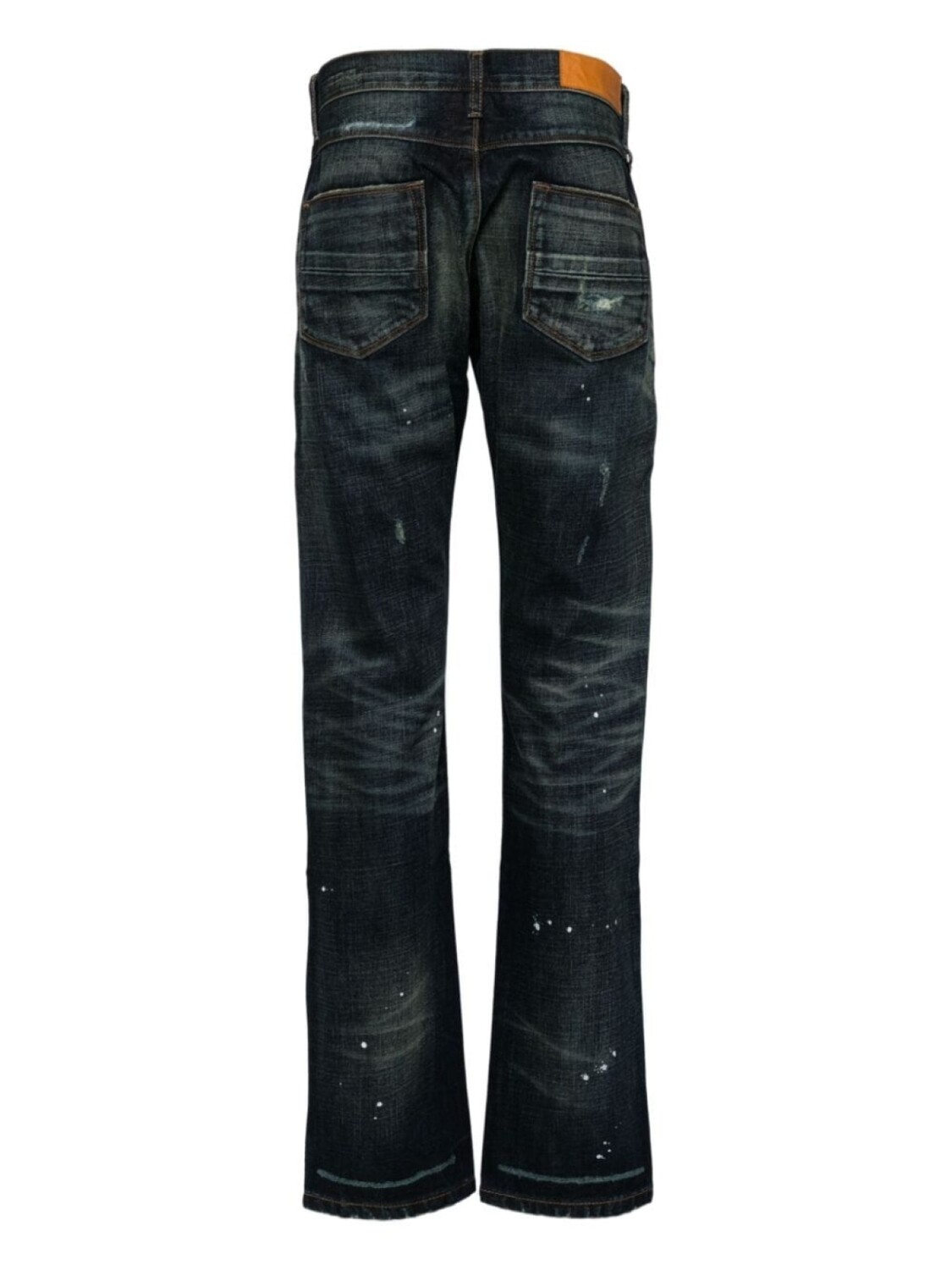 Подробнее о товаре: • индиго/хаки • хлопок • обработанный деним • потайная застежка на молнии и пуговицах • контрастная строчка • эффект потертости • узор с эффектом разбрызганной краски • декоративные складки на бедрах • петли для ремня • классическая пятикарманная модель • нашивка с логотипом сзади • длина в пол • узкий крой • прямой крой